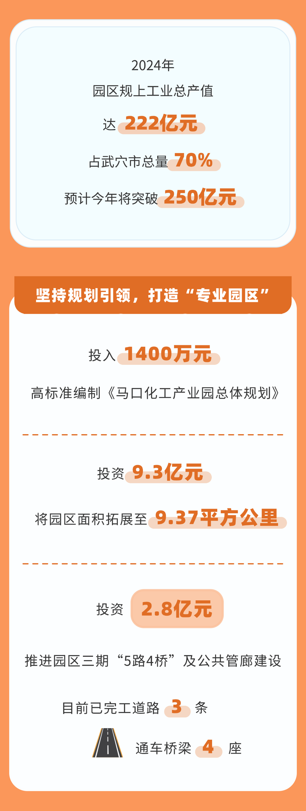 投资 9.3亿元 将园区面积拓展至 9.37平方公里 2.8亿元 投资 推进园区三期"5路4桥"及公共管廊建设 目前已完工道路 3_条 通车桥梁 4 网 坚持系统思维,完善"专项配套" 转自:黄冈发布 投入 2.2亿元 建成危化品停车场、 双回路供电及污水输送公共管廊等 专业化设施 投入 8000万元 改造升级田镇污水处理厂 规划实施总投资 79 7元 的 火电和热电联产项目 预计建成后 园区用电用热成本将下降 20%-30% 搭建智慧园区监管平台 接入 30 家企业关键生产数据 实现 24小时 监测预警 36 77 的 加快推进总投资约 武穴港区多式联运项目 建成后预计降低企业物流成本 15% 投入 2.1亿元 收购瑞华迪森供热企业 和 1700 套人才公寓 投入 180余万元 引入专业保洁公司 坚持务实管用,实施"专项政策" 制定 《医药化工产业高质量发展三年行动方案》 等专项政策 25 项 近三年累计兑现 科技创新奖补资金 1.4亿元 2024年 园区 22 家企业 实现产值 149.3亿元 国家级、省级"专精特新"企业 连续两年实现倍增 总数达到 20 家 近三年累计争取上级资金 1.6亿元 实施技改 ...
