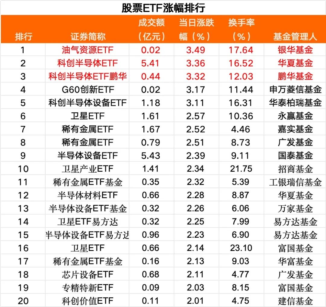 上周五(11月28日),A股市场低开高走,三大指数集体收涨,沪深两市成交量缩至1.59万亿元。 【导读】上周五股票ETF资金净流出44亿元,11月净流入超700亿元 数据显示,截至11月28日,全市场1268只股票ETF总规模达4.55万亿元。 当日股票ETF成交额合计1421.21亿元,与前一交易日1777.47亿元相比缩量超350亿元。其中,易方达基金旗下A500ETF当日成交56.37亿元,位居首位。 此外,A500ETF易方达、中证A500ETF(国泰基金)成交额在40亿元以上。创新药ETF(广发)、A500ETF基金华泰柏瑞、中韩半导体ETF(华泰柏 瑞)、A500ETF(南方)、恒生科技ETF(华泰柏瑞)成交额也在30亿元以上。 从股票ETF二级市场表现看,科创半导体板块领涨。当日除了油气资源ETF(银华基金)以3.49%的涨幅领涨,华夏、鹏华、华泰柏瑞、国泰、万家、易 方达、华夏旗下科创半导体ETF、科创半导体设备ETF或半导体材料ETF,以及永赢、易方达、富国基金旗下卫星ETF等涨幅较为靠前。 稀有金属ETF二级市场涨幅也较大。稀有金属ETF(嘉实)、稀有金属ETF(广发)、稀有金属ETF(工 ...