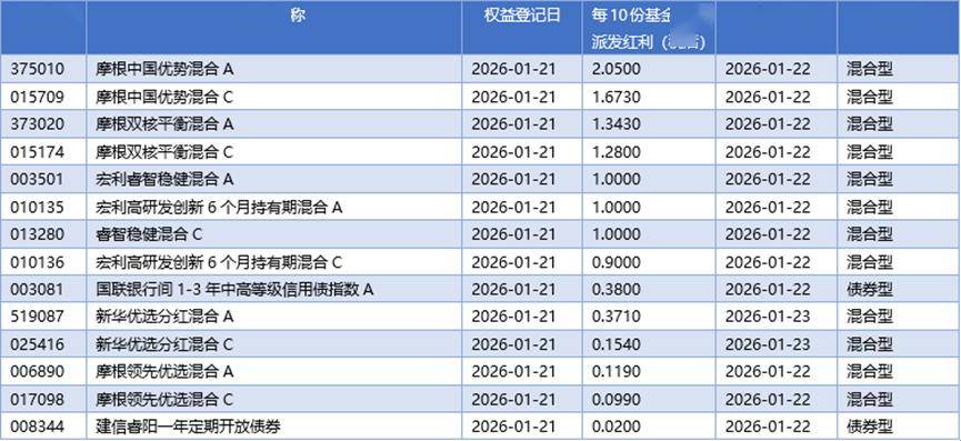 一、交易提示 2025年四季报显示,明星基金经理普遍减持高热度抱团股,将仓位向性价比更高的中盘科技、顺周期制造及低估值消费扩 散。尽管科技股仍是核心叙事,但选股逻辑已从"赛道贝塔"转向"阿尔法+现金流",持仓结构呈现行业更分散、个股更均衡 的新特征,为2026年潜在风格切换预留空间。 A股四大指数集体上涨,截至收盘,沪指涨0.08%,报4116.94点,深成指涨0.7%,报14255.13点,创业板指涨0.54%,报3295.52点,科创 50指数涨3.53%,报1535.39点。沪深京三市成交额26236亿元,较上日缩量1805亿元,三市超3000只个股飘红。板块题材上,黄 金、有色金属、天然气、半导体、CPO、PCB、足球概念股涨幅居前;白酒、电网设备、煤炭、银行、保险、零售、旅游及 酒店、机场航运板块跌幅居前。 三、01月21日新发基金一览(不包含传统封闭式基金) 四、01月21日基金分红一览 | | | | 每10份基金 | | | | --- | --- | --- | --- | --- | --- | | | | | 派发红利(CLL) | | | | 375010 | 摩根中国优势混合 A | ...