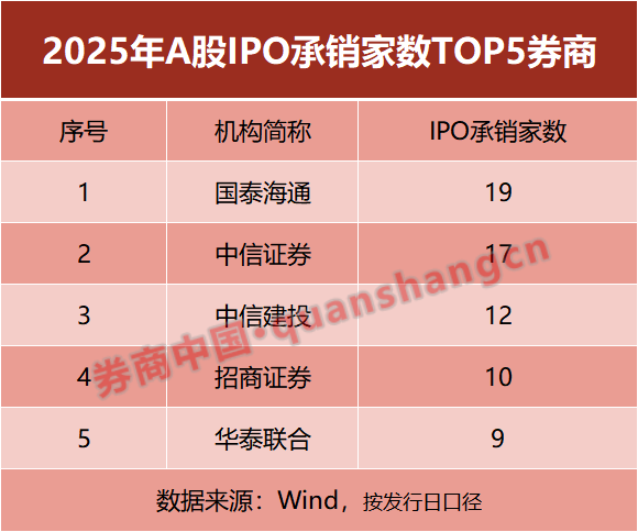 Core Viewpoint - The competition landscape for IPO underwriting in the A-share market has solidified, with leading brokerages maintaining a stronghold while smaller firms carve out niches in specific segments [1] Group 1: IPO Underwriting Landscape - The top five brokerages accounted for approximately 50% of the total IPO underwriting in 2025, indicating a high concentration in the industry [1] - The leading brokerages in IPO underwriting for 2025 are Guotai Junan (19), CITIC Securities (17), CITIC Jianou (12), China Merchants Securities (10), and Huatai United (9) [1] Group 2: Science and Innovation Board - The Science and Innovation Board (STAR Market) raised a total of 633.71 billion yuan, nearly half of the total IPO fundraising for the year, highlighting its significance for financing technology and emerging industries [2] - CITIC Securities led the STAR Market with an underwriting scale of 168.95 billion yuan, capturing a market share of 44.64% [2] - Notable projects such as Moore Threads contributed significantly to CITIC Securities' underwriting scale, while Huatai United's project with Muxi Co. accounted for 92% of its STAR Market underwriting [2] Group 3: Growth in Other Markets - In the Growth Enterprise Market (GEM), Guotai Junan and China Merchants Securities showed a strong advantage, followed closely by CITIC Securities, Shenwan Hongyuan, and CICC [4] - The top five brokerages for GEM IPO underwriting in 2025 were Guotai Junan (6), China Merchants Securities (4), CITIC Securities (3), Shenwan Hongyuan (3), and CICC (2) [4] Group 4: North Exchange Market - The North Exchange Market continued to focus on serving innovative small and medium-sized enterprises, with the top five brokerages being China Merchants Securities, Huatai United, Dongfang Securities, Guotou Securities, and Guojin Securities [6] Group 5: Regulatory Environment - The China Securities Association's evaluation of securities firms' investment banking quality in 2025 showed that 12 firms received an A rating, with five firms maintaining this rating for two consecutive years, indicating stable business quality management [7] - The shift of over half of last year's A-rated firms to B or C ratings reflects the dynamic optimization of the evaluation system and the ongoing trend of strict regulation and compliance in the securities industry [7] Group 6: Outlook for 2026 - The IPO market is expected to remain active in 2026, with a steady growth pace and structural optimization, particularly in the dual innovation sector [9] - Hard technology companies in fields such as semiconductors, artificial intelligence, quantum computing, commercial aerospace, and biomedicine are anticipated to increase their presence in the capital market [9] - The competition among brokerages is expected to intensify, with a focus on serving technological innovation and industrial upgrades, as well as the evolving competitive landscape between leading firms and niche players [9]