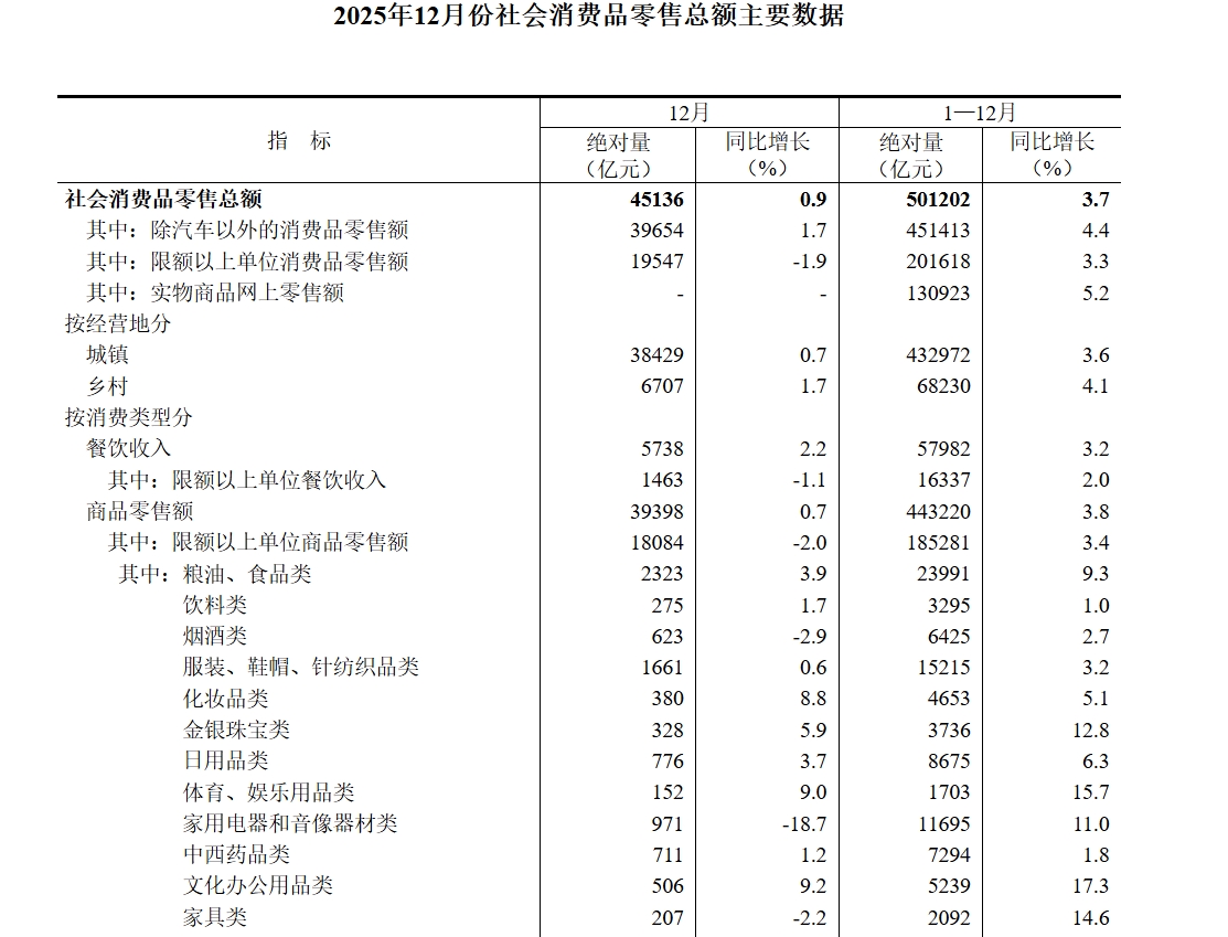 Core Viewpoint - The significant increase in international gold prices, which rose over 60% in the past year, has led to record high domestic gold prices and a corresponding growth in retail sales of gold and jewelry in China, with a projected retail sales figure of 373.6 billion yuan for 2025, marking a 12.8% increase [1][2]. Group 1: Market Performance - In December, the total retail sales of consumer goods reached 45,136 billion yuan, with a year-on-year growth of 0.9%, while the retail sales excluding automobiles grew by 1.7% [2]. - The retail sales of gold and jewelry in December were 328 billion yuan, reflecting a 5.9% year-on-year increase, and the annual figure for 2025 is projected at 373.6 billion yuan, a 12.8% increase [2][4]. - Despite the overall increase in retail sales, many businesses are facing pressure on sales volumes, as the surge in gold prices has led to cautious consumer behavior regarding non-essential purchases [2][3]. Group 2: Company Performance - Chow Tai Fook (01929.HK) reported a revenue of 38.99 billion HKD for the first half of the 2026 fiscal year, a decrease of approximately 1.1% year-on-year, while net profit increased slightly by 0.16% [5]. - Mengjin Garden (02585.HK) reported a revenue of 10.451 billion yuan for the first half of 2025, a year-on-year increase of 4.72%, but faced a net loss of 70.09 million yuan, contrasting with a profit of 47.43 million yuan in the previous year [5]. - China Gold (600916.SH) expects a significant decline in net profit for 2025, projecting a decrease of 55% to 65%, with net profit estimates ranging from 286 million to 368 million yuan [6]. Group 3: Consumer Behavior - Consumer interest in gold has shifted, with purchases primarily driven by weddings and special occasions, while discretionary spending on gold has decreased due to high prices [3][4]. - There is a notable divide in the market, with high-end brands like Lao Pu experiencing strong demand, evidenced by long queues at their stores during peak shopping periods [8][9]. - Younger consumers are increasingly willing to pay a premium for unique and emotionally valuable gold products, contributing to a resurgence in certain brands [8][9]. Group 4: Future Outlook - The price of gold continues to rise, with predictions indicating that it may reach between 4,700 to 5,100 USD per ounce by the end of 2026, representing a potential increase of 15% to 30% [12]. - The market is witnessing a transformation, with a focus on cultural and product originality, as highlighted by recent investments in innovative jewelry brands [11].