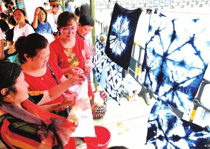 2020年6月,自贡举行"文化和自 然 遗 产 日"集中宣传 展 示 活动,观众感受自贡扎染非遗魅力。本报资料图 遗展。本报资料图 自贡举办的扎染活动。图据自贡方志 □刘可欣 秦怡 "缬(xié)",指以染色工艺形成的花纹织物。在诗词中,缬往往承载着美好的意象。如薛涛"竟将红缬 染轻纱"、白居易"成都新夹缬,梁汉碎胭脂"。流传于四川自贡的"蜀缬",即自贡扎染,便是典型代 表。 张晓平扎染作品《八十七神仙卷》(局部)。图据成华文体旅公众号 2022年7月,自贡扎染亮相成都"天府根脉"非 2 扎染技艺兼顾实用与美观 除了传统题材,自贡扎染常从古典艺术中汲取灵感。四川省工艺美术大师张宇仲创 作 的《簪 花 仕 女 图》,融汇国画与现代艺术手法,线条细致灵动,就连仕女高耸的发髻上,也缀有粉色折枝花与黄、橙 相间的头饰。 张宇仲之女、国家级非遗自贡扎染技艺代表性传承人张晓平,以唐代吴道子《八十七神仙卷》白描长卷 为蓝本进行再创作,复刻了"车辆出行图"等多块汉代画像砖图案;《敦煌伎乐图》则萃取敦煌壁画神 自贡扎染源于秦汉,历史深厚、影响至今,与龚扇、剪纸合称"自贡小三绝"。如今去自贡,体验扎染已 成感受当地文化的重要环节 ...