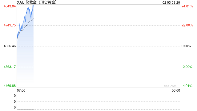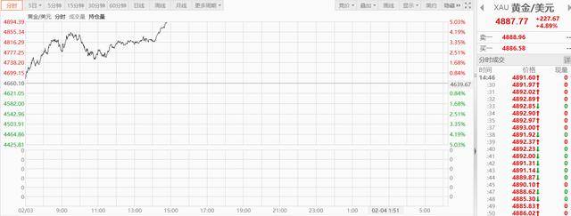 2月3日下午,现货黄金活跃上涨,盘中涨幅超5%,现报4887.77美元/盎司。 ...