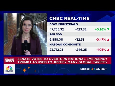 Thanks. Let's get to Emily Wilkins who has that story for us. Hi Emily.>> Hey Margan. Well, yes. The Senate just adopted a resolution that would overturn the powers that Trump used to set up many of his tariffs.This is the AIPA. It's the one that's going in front of the Supreme Court and being debated on. You know, Congress, they do get to assert their power over whether or not the president can continue to use that.And so, they put forward a resolution today. It's actually the third one this week that the ...
