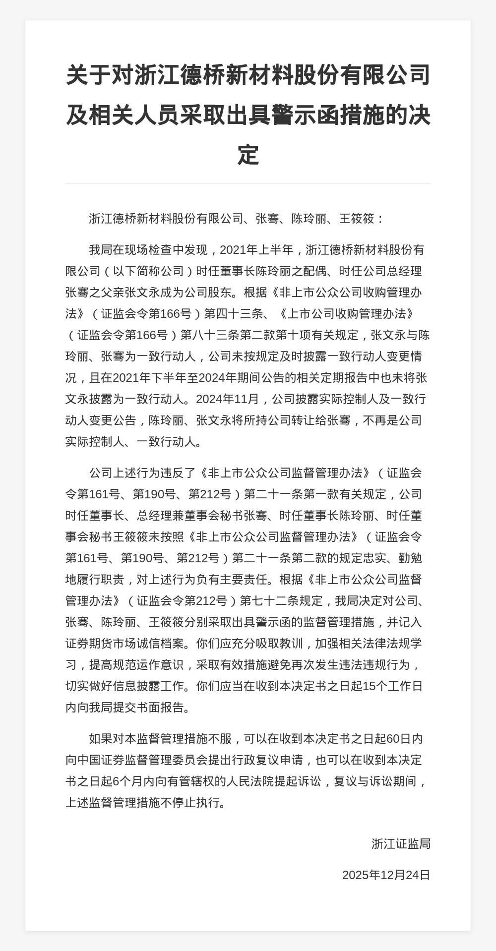 蓝鲸新闻12月26日讯,近日,浙江证监局发布行政监管措施决定书,剑指浙江德桥新材料股份有限公司、张骞、陈玲丽、王筱筱。 决定书显示,2021年上半年,浙江德桥新材料股份有限公司时任董事长陈玲丽之配偶、时任公司总经理张骞之父亲张文永成为公司股东。根据 《非上市公众公司收购管理办法》《上市公司收购管理办法》有关规定,张文永与陈玲丽、张骞为一致行动人,公司未按规定及时披露一致行 动人变更情况,且在2021年下半年至2024年期间公告的相关定期报告中也未将张文永披露为一致行动人。2024年11月,公司披露实际控制人及 一致行动人变更公告,陈玲丽、张文永将所持公司转让给张骞,不再是公司实际控制人、一致行动人。 管理办法》(证监会令第212号)第七十二条规定,我局决定对公司、 张骞、陈玲丽、王筱筱分别采取出具警示函的监督管理措施,并记入 证券期货市场诚信档案。你们应充分吸取教训,加强相关法律法规学 习,提高规范运作意识,采取有效措施避免再次发生违法违规行为, 切实做好信息披露工作。你们应当在收到本决定书之日起15个工作日 内向我局提交书面报告。 如果对本监督管理措施不服,可以在收到本决定书之日起60日内 向中国证券监督管 ...