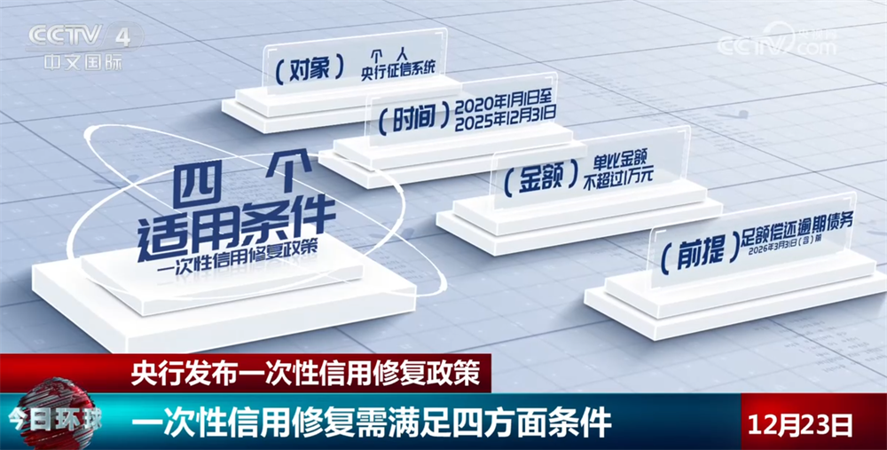 (央视财经《经济信息联播》)22日,中国人民银行出台一次性信用修复政策,支持信用受损但积极还 款的个人高效便捷重塑信用。新政策将于明年1月1日起实施。 适用前提:为个人在2026年3月31日前(含3月31日)足额偿还逾期债务。 符合上述条件的逾期信息,将作不予展示处理,在政策实施后,个人信用报告中的"还款状态"将由逾期 标识调整为正常标识。 中国人民银行副行长 邹澜:目前央行征信系统已经成为我国一项重要的金融基础设施,日均对外提供 查询服务达到两千万笔。 本次信用修复政策主要有四个方面的适用条件: 适用对象:限定于个人在中国人民银行征信系统中展示的信贷逾期信息 适用时间区间:要求逾期信息产生于2020年1月1日至2025年12月31日期间 适用金额:为单笔逾期金额不超过1万元 央行表示,这项政策是精准修复,绝非"征信洗白",核心是解决群众"信用困境",绝非债务豁免,只有 全额结清逾期债务,才能享受信用记录调整的政策红利,债务偿还的核心责任并未免除;"守信激励、 失信惩戒"始终是我国信用体系的重要原则,这条"底线"也从未动摇。 中国人民银行副行长 邹澜:在个人层面,政策为曾经失信的个人提供容错纠正的机会,有助于 ...