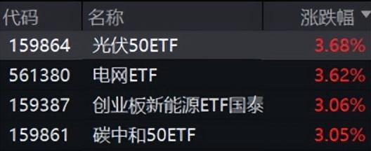 11月5日,新能源板块午后迎来普涨,创业板新能源ETF(159387)、光伏50ETF(159864)、电网ETF(561380)、碳中和50ETF(159861)涨超3%, 领跑市场。 | 代码 | 名称 | 涨跌幅 ▼ | | --- | --- | --- | | 159864 | 光伏50ETF | 3.68% | | 561380 | 电网ETF | 3.62% | | 159387 | 创业板新能源ETF国泰 | 3.06% | | 159861 | 碳中和50ETF | 3.05% | 三季度业绩表现催化,新能源板块向好 锂电收入利润改善最为明显,主要系:1)动力领域:国内乘用车坚挺+重卡报废更新驱动,欧洲电车补贴重启+电车促销与新车周期驱动;2)储能领 域:国内地方政策托底+终端受益改善,美国政策空窗期抢装明显,非美需求延续景气。 光伏板块前三季度业绩仍延续下滑态势,但25Q3利润端已经呈现一定的边际改善态势,主要系:1)反内卷政策初见成效,25Q3硅料硅片价格上涨带动 业绩修复;2)逆变器相关企业受益于下游储能需求较好,业绩依旧延续较好。 风电板块增收增利,经营业绩表现较好,主要系今年上半年 ...