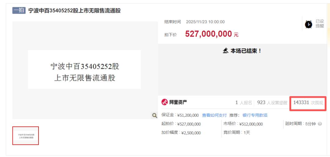 宁波中百(600857.SH)终于要摘下持续多年的"徐翔概念股"标签。 11月23日上午10时,阿里资产拍卖平台显示,宁波中百3540.53万股上市无限售流通股的拍卖正式结束。 从拍卖结果来看,杭州金帝商业管理有限公司(简称"金帝商业")以底价5.27亿元竞得该标的。按此推算,金帝商业获得上述标的的平均每股价格为14.88 元/股,略低于宁波中百当前股价。 11月24日,宁波中百低开,截至发稿报15.06元/股,跌幅0.4%,总市值33.78亿元。 值得注意的是,该场股权拍卖市场关注度极高,累计获得了超14万人次围观。 之所以引发广泛关注,一方面是因其牵涉昔日 "私募一哥" 徐翔家族的核心股权处置;另一方面,作为决定公司控制权转移的关键事件,此次拍卖对宁波 中百的后续影响深远。 资料显示,此次拍卖的宁波中百3540.53万股由徐翔父亲徐柏良旗下公司西藏泽添投资发展有限公司(以下简称"西藏泽添")持有,占其所持公司股份的 100%。西藏泽添为宁波中百控股股东,持有该公司15.78%股份。 中国企业资本联盟副理事长柏文喜表示,控股股东西藏泽添的股权被全部拍卖,在股权过户完成但董事会尚未改选前,宁波中百大概率会处于 ...