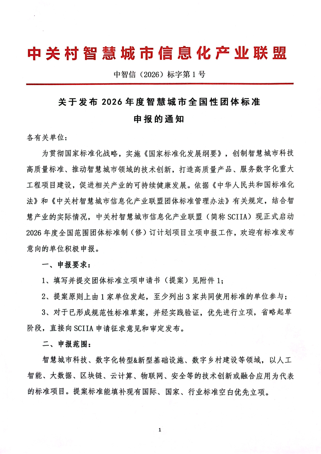 Core Viewpoint - The Zhongguancun Smart City Information Industry Alliance (SCIIA) has officially launched the project application for the formulation and revision of national group standards for smart cities in 2026, aiming to promote high-quality standards and technological innovation in the smart city sector [1][5][31]. Application Requirements - Applicants must fill out and submit a group standard project application form, which should ideally be initiated by one organization with at least three participating organizations [6][33]. - Proposals that have already formed normative standard drafts and have been validated through practice will be prioritized for project approval, bypassing the drafting stage [6][33]. Application Scope - The application covers areas such as smart city technology, digital transformation, new infrastructure, and digital rural construction, focusing on standards that represent technological innovations or integrated applications in artificial intelligence, big data, blockchain, cloud computing, the Internet of Things, and security [2][7][34]. - Proposals that can fill existing gaps in international, national, or industry standards will be prioritized for project approval [2][7][34]. Acceptance Timeline - Applicants must submit the stamped group standard project application form and optionally a standard draft to SCIIA. The standardization department will organize project review within 10 working days of receiving the proposal and will notify the applicant of the acceptance results [29][29]. Organizational Background - SCIIA, established in 2015, is a national-level 4A social organization with independent legal status, encompassing well-known institutions, universities, and enterprises in the smart city field [9][36]. - The alliance aims to promote global cooperation in smart cities, accelerate industrial agglomeration, and contribute to the construction of green digital China and future smart societies [11][38].