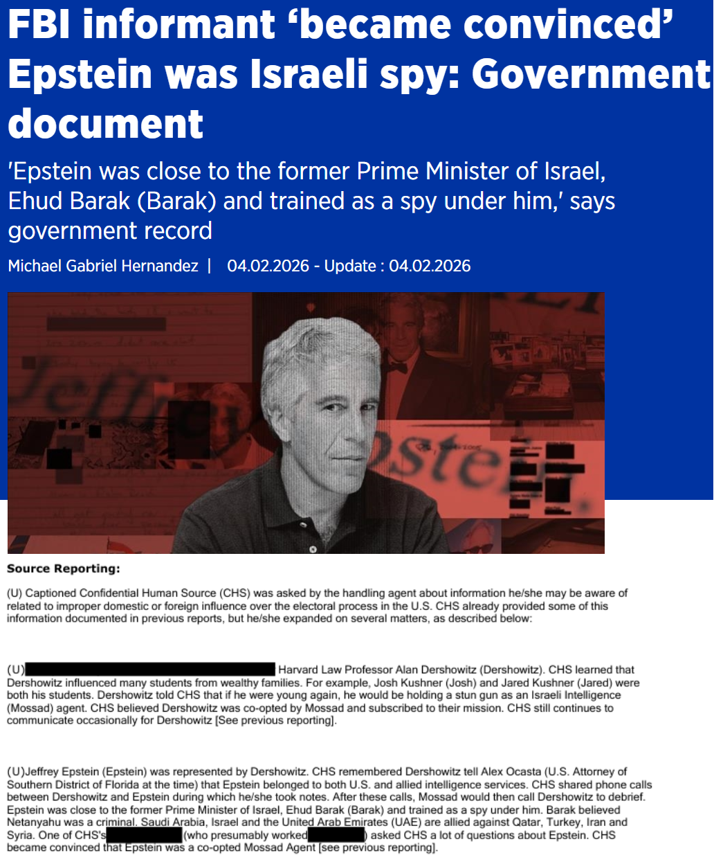 美FBI线人"确信"爱泼斯坦曾为以色列情报机构工作。 报道称,这份美国政府文件记录了这名线人的陈述。该线人回忆,爱泼斯坦的代理律师艾伦·德肖维茨曾告诉美国检察官,"爱泼斯坦在同时为美国 和盟国情报机构工作"。 据土耳其阿纳多卢通讯社4日报道,美国司法部上周公布的新一批爱泼斯坦相关文件显示,一名联邦调查局(FBI)卧底线人"确信"美国已故性犯罪 者杰弗里·爱泼斯坦曾为以色列情报机构(摩萨德)工作。 文件写道,该线人提供了德肖维茨与爱泼斯坦之间通话记录的笔记。这些通话结束后,摩萨德特工会打电话给德肖维茨要求汇报。文件还称,"爱 泼斯坦与以色列前总理巴拉克关系密切,并在其手下接受过间谍训练。"该线人表示,巴拉克"认为内塔尼亚胡是罪犯",在涉及以色列的地区竞争 背景下,该线人"确信"爱泼斯坦曾为摩萨德工作。文件有一处注释"参见此前的报告",但所指的具体内容不明。 这名卧底线人还告诉美国FBI,德肖维茨曾说"如果他年轻一些,他会成为一名以色列情报机构(摩萨德)特工,并手持电击枪"。文件写道,"线人 认为德肖维茨被摩萨德收买,并认同他们的使命"。 这份文件来自美国司法部1月30日公布的数百万页爱泼斯坦案相关文件,除了德肖 ...