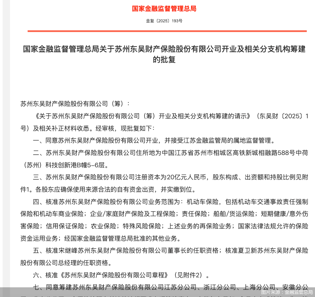 苏州东吴财产保险股份有限公司(以下简称"东吴财险")获批开业,董事长、总经理同步就位。4月14日,金融监管总局发布批复表示,同意东吴财险开 业。此外,除了业务范围获批,宋继峰、夏卫新还分别获批担任东吴财险董事长和总经理。北京商报记者通过近日公布的相关招聘信息了解到,该公司 近百个岗位如火如荼招聘中。 东吴财险获批开业 4月14日,金融监管总局发布关于东吴财险开业及相关分支机构筹建的批复显示,同意东吴财险开业,并接受江苏金融监管局的属地监督管理。该公司注 册资本为20亿元。 金融监管总局还同意筹建东吴财险江苏分公司、浙江分公司、上海分公司、安徽分公司、北京分公司。 东吴财险的业务经营范围也公之于众。金融监管总局表示,核准东吴财险业务范围为:机动车保险,包括机动车交通事故责任强制保险和机动车商业保 险;企业/家庭财产保险及工程保险;责任保险等。 对于此前历经筹建阶段的东吴财险而言,此次获批开业无疑又迈出了关键一步。在业内人士看来,一纸批文的背后,标志着东吴财险正式踏入保险市 场。 据了解,东吴财险由国发集团发起筹建,2024年9月获金融监管总局正式批复,成为苏州唯一国有控股财险法人主体。同年12月,金融监管总局再 ...