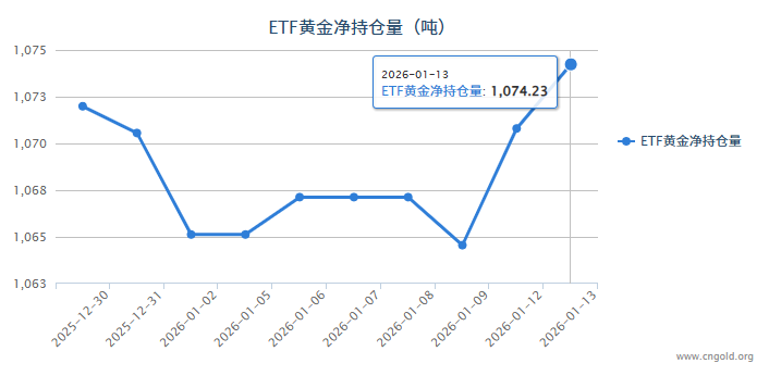 Group 1 - The largest gold ETF, SPDR Gold Trust, reported a holding of 1,074.23 tons of gold as of January 13, with an increase of 3.43 tons from the previous trading day [1] - On January 13, the spot gold price closed at $4,594.90 per ounce, reflecting a decline of 0.18%, with an intraday high of $4,644.00 and a low of $4,576.70 [1] - The outlook for gold and silver remains optimistic through 2026, driven by geopolitical tensions, concerns over the independence of the Federal Reserve, and a lack of fiscal discipline in the U.S. [3] Group 2 - The expectation is that gold trading prices will exceed $5,000 per ounce in the second half of the year [3]