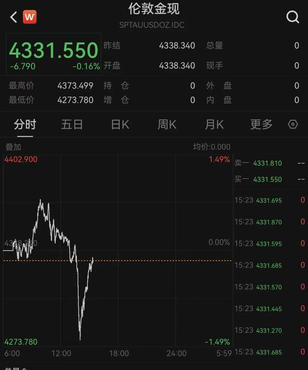 每经编辑|程鹏 12月31日午后,贵金属板块变绿,黄金、白银、铂金价格纷纷下跌。 现货黄金直线下跌,一度下跌1.50%失守4300美元/盎司,现跌0.16%;现货白银一度跌超7%,现跌5.02%。 | ( W | | | 伦敦金现 | | | | | | | --- | --- | --- | --- | --- | --- | --- | --- | --- | | | SPTAUUSDOZ.IDC | | | | | | | | | 4331.550 Ff | | | | 4338.340 | | 总量 | | 0 | | -6.790 | | -0.16% 升盘 | | 4338.340 | | 现手 | | 0 | | 最高价 | 持 | 4373.499 世 | | | 0 | Ar 智 | | 0 | | 最低价 | 福 | 4273.780 它 | | | 0 | 内 盘 | | 0 | | 书时 | | 五日 日K | | 居K | | 月K | 白天 | | | 量加 | | | | | | 均价:0.000 | | | | 4402.900 | | | | | | 1.49% | 4331 ...
