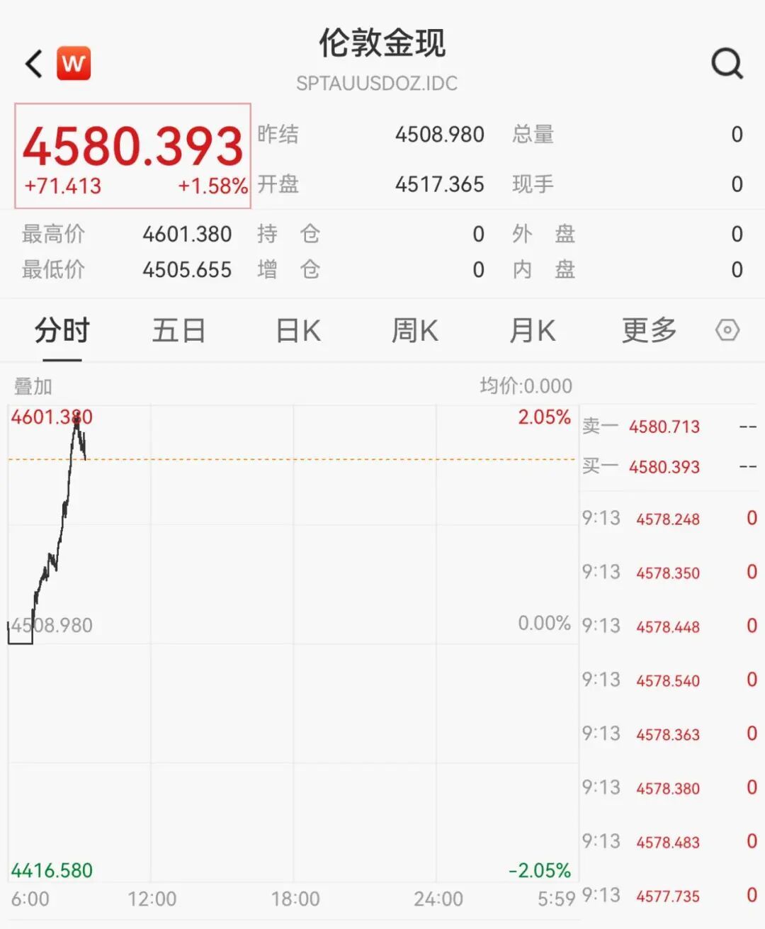 Core Viewpoint - The article highlights the surge in spot gold prices, which reached a historical high of $4601.38 per ounce, driven by geopolitical risks and increased demand for safe-haven assets [2][6]. Group 1: Gold Market Performance - Spot gold prices have risen significantly, breaking through key levels of $4400, $4500, and $4550, ultimately reaching $4601.38 per ounce [2]. - As of the latest update, spot gold is reported at $4580.393 per ounce, reflecting a daily increase of 1.58% [2][3]. - The New York futures gold price also surpassed $4610 per ounce, currently reported at $4602.5, with a daily increase of 2.26% [3][4]. Group 2: Silver Market Performance - Spot silver prices have increased by 4%, reaching a high of $84 per ounce, marking a new historical peak [4][5]. - The latest report indicates spot silver at $83.527 per ounce, showing a rise of 4.72% [5]. Group 3: Geopolitical Influences - Rising geopolitical risks associated with Iran and Venezuela have reignited market demand for gold as a safe-haven asset [5][6]. - The strong performance of gold, silver, and platinum at the beginning of the year reflects a combination of geopolitical hedging, financial flows, and structural investment themes [6]. Group 4: Central Bank Activities - In 2025, global central banks have increased their gold holdings multiple times to enhance portfolio diversity and stability, contributing to the surge in international gold prices [6]. - Conversely, the US dollar index has been in a continuous downward trend since the beginning of 2025, leading to a declining share of the dollar in global foreign exchange reserves [7].