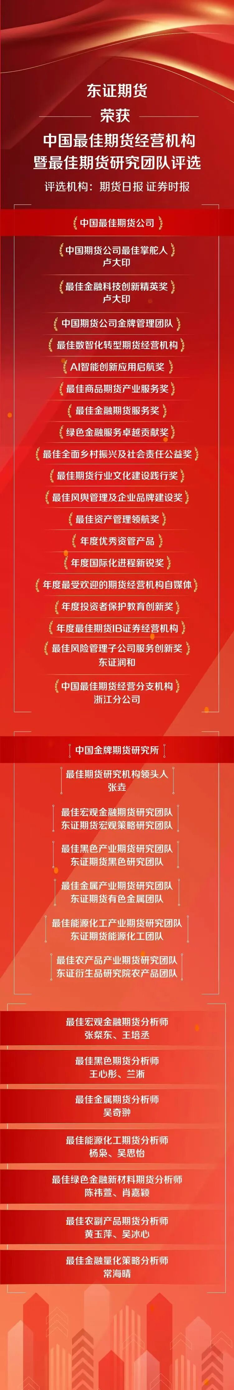 11月26日,由《期货日报》与《证券时报》联合主办的"2025第十八届中国最佳期货经营机构暨最佳期 货研究团队"评选颁奖典礼在长沙举行,上海东证期货有限公司(以下简称"东证期货"或"公司")以卓越的 综合实力一举摘得26项大奖,囊括"中国最佳期货公司"、"中国金牌期货研究所"等重量级奖项,公司旗 下12名分析师荣膺"最佳分析师"称号。此次获奖,是行业对公司在深耕金融科技、推进国际化战略、服 务实体经济等方面所取得的重要成果的肯定。 科技驱动创新,打造研究和技术两大核心竞争力 公司以智能投研平台繁微为核心载体,持续通过品种投教、基本面数据分析,解决了部分交易者投研能 力弱、信息处理难等痛点。更在今年,繁微实现了AI 技术驱动的突破性服务模式升级,重点攻克了对 海量非结构化数据的梳理,可自动完成研报的核心观点提炼、逻辑梳理和数据提取,快速生成结构化摘 要,极大提升了交易者们获取关键信息的效率。同时,结合公司开发的极速交易系统"东方雨燕"、期货 零售平台"智达Pro"和大宗商品期货贸易管理"大宗精灵",共同为客户搭建了有效管理期货、期权价格 风险的有力武器。公司已连续三年获得由中国人民银行和中国证监会联合主办的"金 ...
