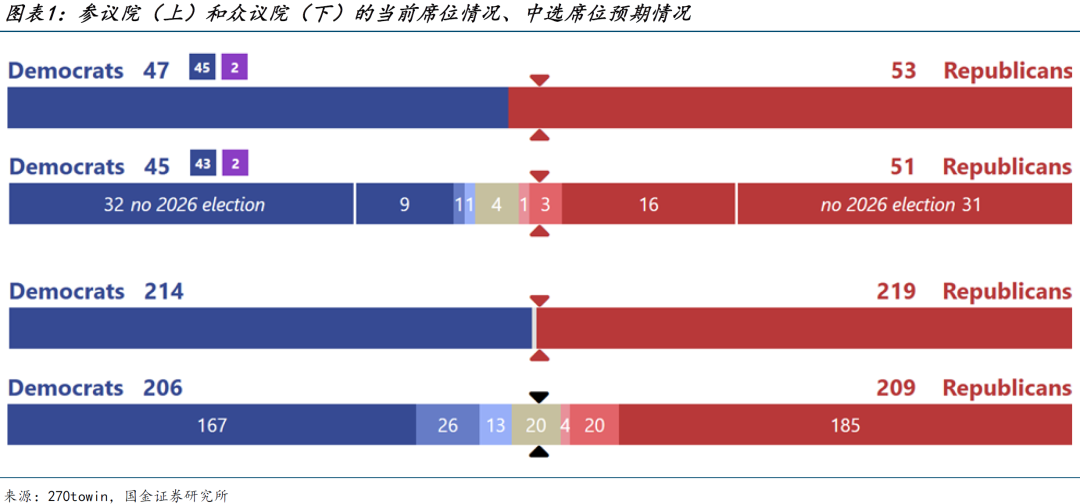 特朗普第二任期以来,刀刃向内,两党对立达到新高度,如果中选失利,不难想象民主党的"复仇之火"。更为严峻的是,考虑到法律、年龄、健康等因 素,特朗普已不太可能谋求第三任期,一旦中选失利,当单纯忠于特朗普不再符合长期政治利益,共和党内部将出现显著裂痕。近期的爱泼斯坦案,众议 院民主党人主导的公开文件请愿之所以能凑齐票数,就在于4名共和党人倒戈,其中包括1名特朗普曾经的亲密盟友。 二、特朗普的中选前景并不乐观 共和党继续控制参议院的问题不大。参议院共有100个席位,共和党和民主党控制的席位对比为53:47。参议员的任期为六年,每两年仅需重选1/3席位, 因此明年中选需要重选33席,其中20席由共和党控制,13席由民主党控制。另外,明年中选还将进行2个席位的特别选举,用于接替担任副总统的万斯和 担任国务卿的鲁比奥。 虽然共和党的重选席位更多,但大部分是其铁盘,选情并不落下风。根据270towin的预测,35个重选席位当中仅有6个席位的竞争相对激烈,目前共和党 和民主党各控制3个,因此即便民主党赢下全部6个席位,也只能形成50:50的均势。当票数相等时,将由副总统万斯投下决定性一票,今年特朗普的OBBB 正是这样在参议 ...