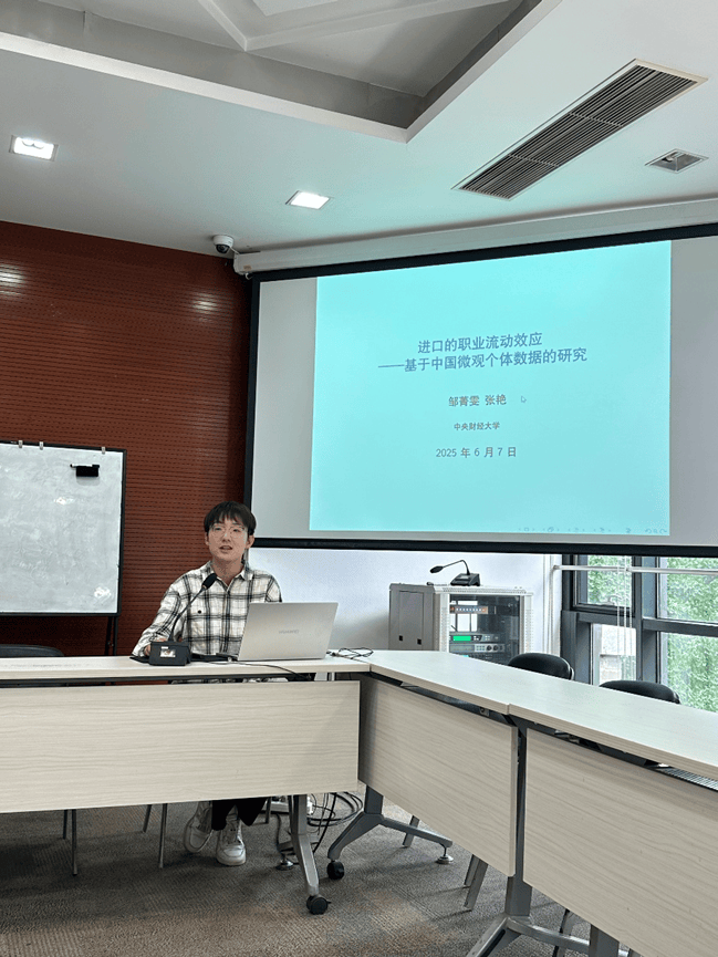 Core Points - The article discusses the implementation of the Central University of Finance and Economics' Graduate Academic Exchange Reward Program to enhance academic enthusiasm among graduate students and expand the school's disciplinary influence [1] Group 1 - The "6th Peking University Economic Science Doctoral Forum" was held to promote academic exchange among universities and provide a platform for young scholars in economics [2] - A graduate student from the International Economics and Trade School presented a paper at the forum, which was accepted after expert review [2] - The paper titled "The Occupational Mobility Effect of Imports: A Study Based on Microdata from China" found that imports significantly promote occupational mobility in the labor market, with skill stratification effects observed [4] Group 2 - The research indicates that high-skilled workers experience lower mobility due to "skill lock-in," while low-skilled workers, despite being forced to adjust, see wage increases [4] - The uncertainty caused by China-US trade tensions has severely suppressed labor market mobility in China [4] - The student expressed that engaging with experts at the forum provided critical feedback for their research and deepened their understanding of macroeconomic policies from a micro perspective [6]