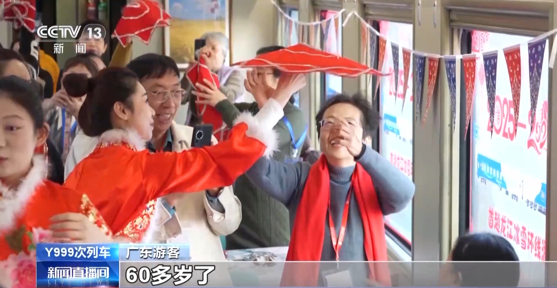 走进车厢可以看到,列车的内外装饰突出冰雪主题元素。列车从哈尔滨出发直达亚布力,畅享滑雪的速度与激情;北上漠河,饱览林海雪原与冰封界江的壮 美景致;最后返回哈尔滨,带游客领略中央大街、冰雪大世界,体验北国风情。 哈尔滨客运段列车长 齐智馨:餐车还为老年旅客定制了低盐低油的健康食谱,软卧每节列车配备了淋浴室,软卧列车床铺为了增强老年人体验感,加深了 床宽。扶手增加了防滑改造。 首趟冰雪环线旅游列车2025年12月28日出发,2026年1月2日返回哈尔滨,历时六天。此后,冰雪环线旅游专列将持续开行至2026年2月,满足银发游客冬季 冰雪旅游的出行需求。 广东游客:我是深圳过来的,60多岁了,第一次到大东北过冬天。 广东游客:我们上车发现这个车次是Y999,又是跨年,所以我们更加开心。 乘坐这趟列车的游客可以在旅途中迎来2026年的新年曙光,列车精心设计"2025-2026"跨年背景墙,供游客打卡拍照。 近期各地冰雪旅游热度攀升,28日,黑龙江今年开行的首趟冰雪环线旅游列车从哈尔滨始发,带天南地北的游客开启跨年环线冰雪游。 ...