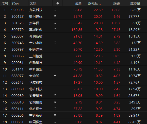10月13日,A股三大指数早盘下跌,截至午盘,上证指数跌1.3%,深证成指跌2.56%,创业板指跌3%。沪深北三市半日成交 15907亿元,较上日缩量654亿元。 板块题材方面,稀土永磁、贵金属、光刻机、转基因、军工装备、半导体板块涨幅居前。稀土永磁板块逆势大涨,包钢股份 等股涨停;军工装备板块低开高走,长城军工涨停;可控核聚变板块走强,合锻智能走出10天6板。 两大稀土巨头再次提价 可控核聚变板块走强 合锻智能10天6板 10月13日早间开盘,可控核聚变板块走强,合锻智能再度涨停迎4连板,也是10个交易日内的第6个涨停板。安泰科技3连 板,中洲特材、中国核建跟涨。 近期,核聚变激起资本市场热情。10月10日,可控核聚变指数创下历史新高。自去年"9·24"行情以来,核聚变指数累计大涨 超120%。 稀土股逆势上涨 10月13日上午,A股市场稀土股逆势上涨。截至午间收盘,银河磁体、新莱福"20cm"涨停,惠城环保涨超19%,包钢股份、 北矿科技等纷纷涨停,北方稀土大涨超9%。 | 序号 | 代码 | 名称 | ● | 最新 | 涨幅% 7 | 涨跌 | 成交量 | | --- | --- | --- | --- ...