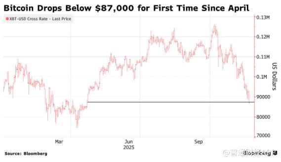 Group 1 - The cryptocurrency market continues to weaken, extending a decline that has lasted over a month, with Bitcoin dropping over 4% and falling below $87,000 for the first time since April [1] - Large-scale selling by whales, based on the "four-year cycle theory," has led to over $20 billion in sell-offs since September, contributing to the current price decline [2] - The recent downturn in Bitcoin is closely linked to a significant "forced liquidation wave" in October, where over $19 billion in leveraged positions were liquidated, severely impacting market momentum and liquidity [2] Group 2 - The macroeconomic uncertainty is exacerbating market tension, with unclear Federal Reserve policy paths suppressing investor risk appetite, particularly in high-risk assets [3] - The options market is focusing on key support levels, with strong demand for protection around $85,000 and $82,000, indicating traders are preparing for further declines [2] - The cryptocurrency market is experiencing a "cross-asset divergence," with the volatility in the stock market, particularly related to AI valuations and Federal Reserve interest rate expectations, contrasting with the ongoing deleveraging and declining retail demand in the crypto space [2]
