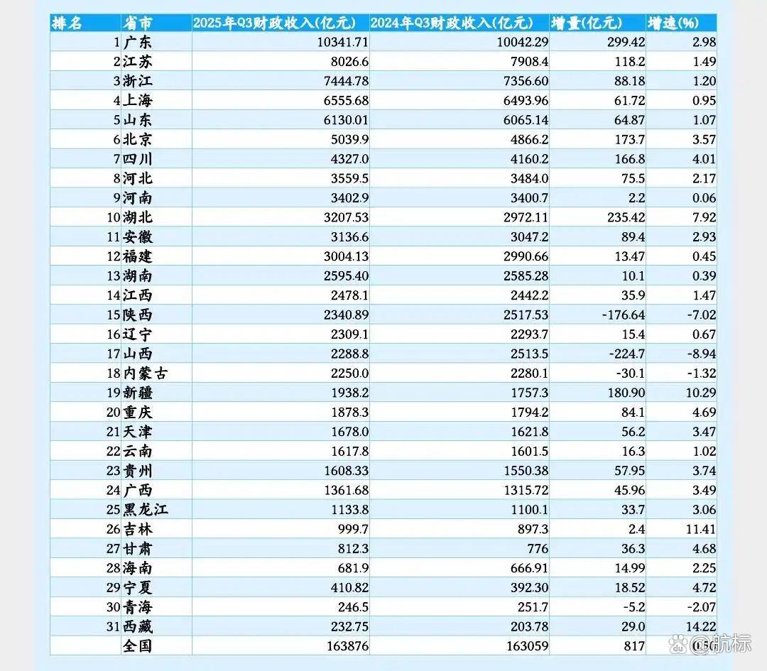 2025 年前 9 个月,全国 31 省份财政收入数据正式揭晓:全国合计达 163876 亿元,同比微增 0.5%,这是各地区位优势与政策红利共同托举的经济韧性体 现。但榜单里的分化格外醒目:老牌强市上海增速不足 1% 显 "慢节奏",中原大省河南首次站上 3500 亿台阶,西北的新疆更是以超 10% 的增速反超重庆 —— 这些表现背后,藏着不同省份的发展逻辑,我们逐一拆解。 | 省市 | 2025年Q3财政收入(亿元) | 2024年Q3财政收入(亿元) | 增量(亿元) | 增速(%) | | --- | --- | --- | --- | --- | | 1 广东 | 10341.71 | 10042.29 | 299.42 | 2.98 | | 2江苏 | 8026.6 | 7908.4 | 118.2 | 1.49 | | 3浙江 | 7444.78 | 7356.60 | 88.18 | 1.20 | | 4上海 | 6555.68 | 6493.96 | 61.72 | 0.95 | | 5山东 | 6130.01 | 6065.14 | 64.87 | 1.07 | | 6北京 | 5039. ...