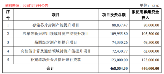 (来源:老张投研) 通富微电,又定增了! 1月9日晚,通富微电发布公告,拟定增募集资金总额不超过44亿元,用于存储芯片、汽车等新兴应用、 晶圆级、高性能计算及通信四大项目的封测产能提升,以及补充流动资金。 事实上,自上市以来,通富微电曾进行多次融资。 2007年以来,公司共进行了6次直接融资,募资总额约为107.57亿元,主要用于产能建设,以及AMD苏 州和槟城的收购等投资项目。 | 片 목 | 项目 | 项目投资总额 | 拟使用募集资金 投入 | | --- | --- | --- | --- | | 1 | 存储芯片封测产能提升项目 | 88,837.47 | 80,000.00 | | 2 | 汽车等新兴应用领域封测产能提升项目 | 109.955.80 | 105,500.00 | | 3 | 晶圆级封测产能提升项目 | 74,330.26 | 69,500.00 | | ব | 高性能计算及通信领域封测产能提升项目 | 72.430.77 | 62,000.00 | | ર | 补充流动资金及偿还银行贷款 | 123,000.00 | 123,000.00 | | | 合计 | 468,554.30 ...