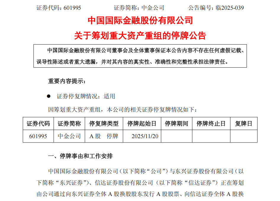 11月19日晚,中金公司(601995)、东兴证券(601198)、信达证券(601059)三家券商几乎同时发布停牌公告,筹划由中金公司通过换股方式吸收合并东 兴证券和信达证券。按三季报数据粗略相加,合并后新券商资产规模将超过万亿元,在行业中仅次于中信证券(600030)、国泰海通(601211)和华泰证券 (601688)。 对资本市场而言,这是"汇金系"券商版图的一次重排;对基金行业而言,更直接的悬念在于:同属中央汇金控制的三家券商,其背后的中金基金、信达澳亚 基金和东兴基金是否会因此被纳入同一套体系,公募牌照如何排阵、如何分工? | 证券代码 证券简称 停复牌类型 停牌起始日 停牌期间 停牌终止日 复牌日 | | | --- | --- | | 601995 中金公司 A股 停牌 | 2025/11/20 | | 截止日期 | 基金类型 全部 | ∨ 机构类型 全部 | V | 剔除ETF联接基金份额/净值 仅展示公募持牌 | | | --- | --- | --- | --- | --- | --- | | 序号 | 公司名称 ⇒ | 草学类型 | 资产净值合计(亿元) = | 资产净值排名 ۾ | ...