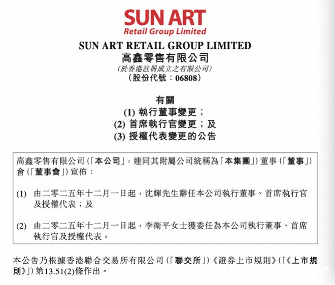 Core Viewpoint - Gao Xin Retail appointed Li Weiping as the new Executive Director and CEO, effective December 1, following the resignation of former CEO Shen Hui due to family commitments [1][3]. Group 1: Leadership Change - Li Weiping has over 20 years of management experience in the retail industry, previously serving as Chief Merchandise Officer at Hema and holding various leadership roles at Hema and other companies [3]. - The company expects Li's expertise to align with its three-year strategic plan, focusing on product differentiation and supply chain efficiency [3]. Group 2: Financial Performance - Gao Xin Retail reported a revenue of 30.502 billion RMB for the six months ending September 30, a decrease of 12.1% year-on-year [4][6]. - The gross profit margin improved to 25.3%, an increase of 0.7 percentage points compared to the previous year [4]. - The company recorded a loss attributable to equity shareholders of 1.23 billion RMB, compared to a profit of 206 million RMB in the same period last year [4][6]. Group 3: Strategic Focus - The company aims to implement its three-year strategy, emphasizing fresh produce differentiation and efficient supply chain management [6]. - Gao Xin Retail plans to enhance its multi-format approach, combining large supermarkets, medium-sized supermarkets, and front warehouses to cater to diverse consumer needs [6]. - The company has completed the renovation of three stores in East China, resulting in double-digit growth in customer traffic, with plans to renovate over 30 stores this fiscal year and more than 200 stores by the next fiscal year [7].