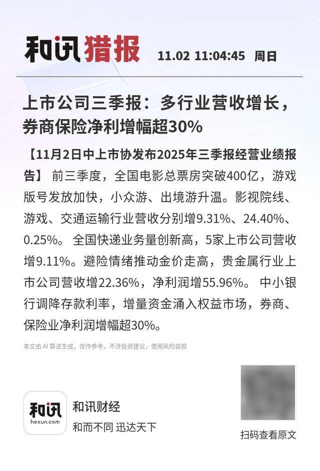 【11月2日中上市协发布2025年三季报经营业绩报告】前三季度,全国电影总票房突破400亿,游戏版号 发放加快,小众游、出境游升温。影视院线、游戏、交通运输行业营收分别增9.31%、24.40%、 【11月2日中上市协发布2025年三季报经营业绩报 告】 前三季度,全国电影总票房突破400亿,游戏 版号发放加快,小众游、出境游升温。影视院线、 游戏、交通运输行业营收分别增9.31%、24.40%、 0.25%。 全国快递业务量创新高,5家上市公司营收 增9.11%。避险情绪推动金价走高,贵金属行业上 市公司营收增22.36%,净利润增55.96%。中小银 行调降存款利率,增量资金涌入权益市场,券商、 保险业净利润增幅超30%。 本文由 Al 算法生成,仅作参考,不涉投资建议,使用风险自担 和讯财经 和而不同 迅达天下 扫码查看原文 0.25%。 全国快递业务量创新高,5家上市公司营收增9.11%。避险情绪推动金价走高,贵金属行业上市 公司营收增22.36%,净利润增55.96%。 中小银行调降存款利率,增量资金涌入权益市场,券商、保险 业净利润增幅超30%。 本文由 AI 算法生成,仅作参考,不涉投资建议,使 ...
