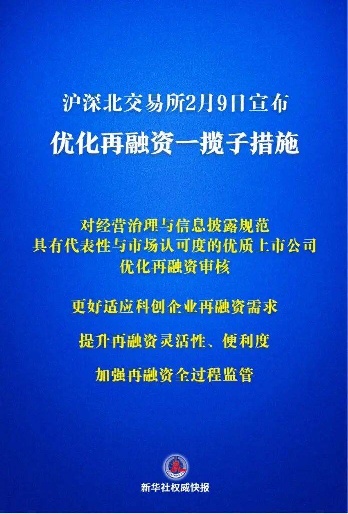 此外,沪深北交易所还明确提升再融资灵活性、便利度,加强再融资全过程监管。 2月9日,沪深北交易所宣布优化再融资一揽子措施。 在进一步支持优质上市公司创新发展方面,沪深北交易所明确, 对经营治理与信息披露规范,具有代 表性与市场认可度的优质上市公司,优化再融资审核,进一步提高再融资效率。 同时,为更好适应科创企业再融资需求,沪深交易所已修订上市公司"轻资产、高研发投入"规则,明确 主板企业认定标准。 沪深北交易所存在破发情形的上市公司,可以通过定增、发行可转债等方式合理 融资,募集资金需投向主营业务。 北交所还提出,提高对创新型中小企业再融资的制度包容性。其中提出,支持按照未盈利标准上市且尚 未盈利的科创企业按需、合理实施再融资。 来源:新华社、人民财讯 责编:陈丽湘 ...