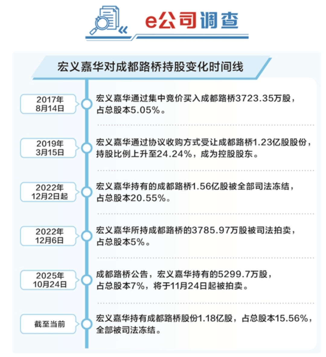 Core Viewpoint - The ongoing power struggle over Chengdu Road and Bridge (成都路桥) highlights the complexities of governance in listed private enterprises, with significant implications for its control and ownership structure [1][2][3] Group 1: Control Changes - Chengdu Road and Bridge has experienced multiple changes in control over the past decade, starting from the founder Zheng Yuli's departure in 2015, leading to external capital involvement and subsequent ownership shifts [2][3] - In 2018, Hongyi Jiahua, led by Liu Zhihong, acquired a controlling stake in Chengdu Road and Bridge, spending approximately 2.1 billion yuan to purchase 21.64% of the shares [2][3] Group 2: Legal and Financial Issues - Hongyi Jiahua's shares were frozen due to contractual disputes, leading to a court-ordered auction of 37.86 million shares in December 2022, reducing its stake to 15.56% [3][4] - A new agreement in March 2023 allowed East Jun Taida to exercise voting rights over Hongyi Jiahua's remaining shares, effectively transferring control to East Jun Taida [3][4] Group 3: Upcoming Judicial Auction - A judicial auction of 52.997 million shares (7% of total shares) is scheduled for November 24, 2025, with a starting price of approximately 183 million yuan [6][8] - The auction could potentially reduce Hongyi Jiahua's stake to 8.56%, raising concerns about the stability of control within the company [6][8] Group 4: Disputes Over Auction Process - Hongyi Jiahua's management has expressed strong opposition to the split auction process, arguing it undermines shareholder rights and could lead to undervaluation of the shares [7][9] - Allegations have emerged regarding the misuse of a lost company seal to authorize legal representation in the auction process, complicating the situation further [10][12]