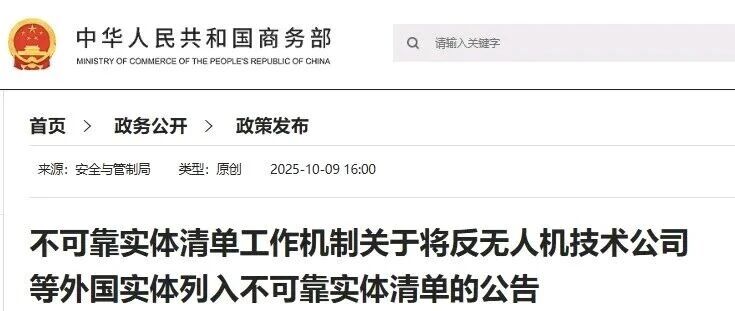 10月9日,商务部发布不可靠实体清单工作机制关于将反无人机技术公司等外国实体列入不可靠实体清单的公告。 公告称,为维护国家主权、安全和发展利益,根据《中华人民共和国对外贸易法》《中华人民共和国国家安全法》《中华人民共和国反外国制裁法》等有关法律, 不可靠实体清单工作机制依据《不可靠实体清单规定》第二条、第八条和第十条等有关规定, 决定将反无人机技术公司、TechInsights公司及其分支机构等外国实 体列入不可靠实体清单,并采取以下处理措施: 一、禁止上述实体从事与中国有关的进出口活动; 本公告未尽事宜,按《不可靠实体清单规定》执行。 本公告自公布之日起实施。 附:被列入不可靠实体清单的外国实体 不可靠实体清单工作机制 (商务部代章) 2025年10月9日 附 被列入不可靠实体清单的外国实体 -TechInsights Inc. -Strategy Analytics GmbH Market Research and Management Consulting 二、禁止上述实体在中国境内新增投资; 三、禁止中国境内的组织、个人与上述实体进行有关交易、合作等活动,特别是向上述实体传输数据、提供敏感信息。 1. ...