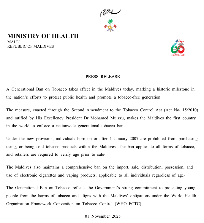 据新华社,马尔代夫卫生部11月1日宣布, 当天起对出生于2007年1月1日及以后的人员实施"世代禁烟令",禁令适用范围包括外国游客。 法新社报道, 马尔代夫由此成为目前全球唯一实施"世代禁烟令"的国家。 按英国媒体说法,"世代禁烟令"意味着出生于某一年份以后的人终生 不得吸烟。 近年来,多国尝试推行类似的"世代禁烟令"。新西兰2022年12月通过相关法案,禁止向2009年1月1日及以后出生人员出售烟草制品,但 该法于2023年11月废止。英国类似法案仍在立法程序中。 根据新规,2007年1月1日及以后出生的人在马尔代夫境内不得购买和使用各类烟草制品,零售商也不得向该群体售卖任何烟草制品,交易 前需核实购买者出生日期。 向不符合规定者销售烟草制品将被处以5万马尔代夫拉菲亚(约合3200美元)罚款。这项禁令对马尔代夫公民和外国游 客均适用。 马尔代夫卫生部同时表示,该国将继续全面禁止进口、销售、持有和使用各类电子烟。 电子烟禁令适用于所有群体,不分年龄。使用电子烟设 备将被处以5000拉菲亚(约合320美元)罚款。 马尔代夫卫生部说,穆 罕默德·穆伊兹总 统今年早些时候提议颁布"世代禁烟令",旨在"保护公共健康, ...