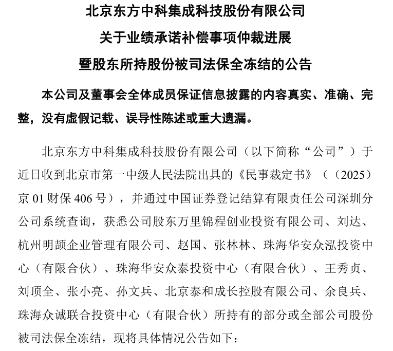 1月4日晚间,东方中科(002819)发布公告,披露公司在业绩承诺补偿事项仲裁程序中取得新进展,北京市第一中级人民法院已裁定对14名未履行补偿义 务的股东所持公司股份实施司法保全冻结,冻结股份总量达6475.00万股,占公司总股本的21.61%。 公司作为申请人,本次被申请人涉及的公司股东包括万里锦程创业投资有限公司、刘达、 杭州明颉企业管理有限公司、赵国、张林林、珠海华安众泓投 资中心(有限合伙)、珠海华安众泰投资中心(有限合伙)、王秀贞、 刘顶全、张小亮、孙文兵、北京泰和成长控股有限公司、余良兵、 珠海众诚联合 投资中心(有限合伙)。 2025/12/31 16:14:21 北京时间 停牌 其中,万里锦程创业投资有限公司持股比例达13.21%,截至2025年三季度报数据显示,该股东为公司的第二大股东。除此之外,刘达、杭州明颉企业管 理有限公司、赵国也均为公司前十大股东。 上述冻结股份属于重大资产重组业绩承诺应履行补偿义务而尚未实际履行补偿义务的股份。 公告显示,此次股份冻结源于相关股东未按《业绩承诺及补偿协议》及其补充协议履行补偿义务。公司已就该事项向中国国际经济贸易仲裁委员会申请仲 裁,目前第三次庭审已 ...