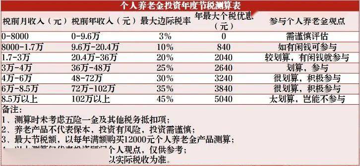 广告 最高市税 5400元 2024年『「个人养老金』年末节税,参缴有礼! © 红包? 现金? 奖励? @ 年度节税 l l 24 Q: 参缴个人养老金育什么好处? 开启宝箱惊喜 百元好礼學你 .. 产品亮点 每年12000元省税额度,最高 安心养老 漫画 储备悠然 可省5400元 全年应纳 全年应纳 税所得额 全年应纳 税所得额 全年应纳 税所得额 全年应纳 96万以上 税所得额 全年应纳 66-96万 税所得额 42-66万 全年 kyzy 税所得额 边际税率 30-42万 边际税率 税所得额 14.4-30万 45% 边际税率 3.6-14.4万 35% 边际税率 0-3.6万 30% 边际税率 录年至高 25% 边际税率 号年至高 20% 5400 边际税率 当年至高 4200 10% 当年至高 3% 节税 当年至高 3000 3600 型转出示 2400 当年至高 节税 360 1200 *全年应纳税所得额=综合所得金额-专项扣除1~基本扣除(6万元)-专项附加扣除-其他扣除?, 1专项扣除指基本养老保险、基本医疗保险、失业保险和住房公积金; 2其他扣除指企业年金、职业年金、符合国家规定的商业健康保 ...
