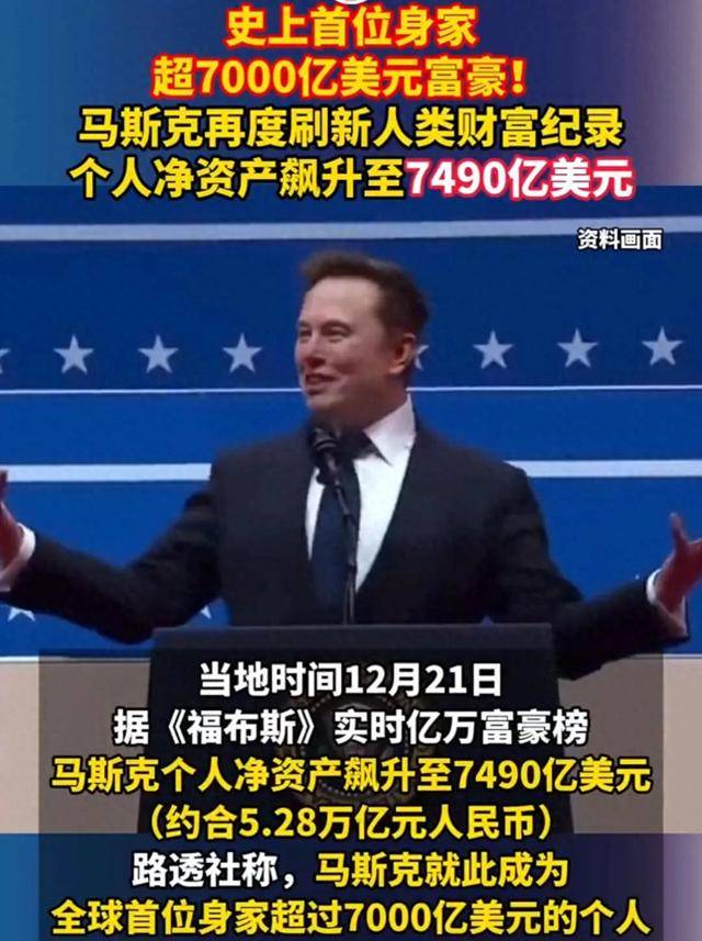 马斯克个人净资产飙升至7490亿美元,约合5.28万亿元人民币,活到80岁每天要花1.8亿元才能花完