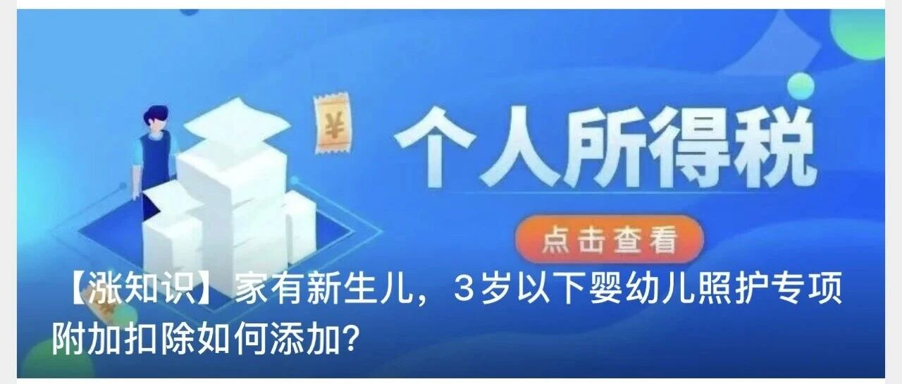 欢迎扫描下方二维码关注: 近期国家发布育儿补贴相关政策利好,有纳税人咨询,税收方面有相关政策优惠吗?刚出生的婴儿能填报个人 所得税综合所得专项附加扣除吗? 今天申税小微就带大家了解一下, 3岁以下婴幼儿照护专项扣除 的政策、注意点及填报操作。 政策介绍 纳税人照护3岁以下婴幼儿子女的相关支出,按照 每个婴幼儿每月 2000元 (2023年1月1日起扣除标准由原每个每月1000元提高 至2000元)的标准定额扣除。 政策依据: 《国务院关于提高个人所得税有关专项附加扣除标准的通知》(国发〔2023〕13号) 《国务院关于设立3岁以下婴幼儿照护个人所得税专项附加扣除的通知》(国发〔2022〕8号) No.1 常见问题 问题一 Hot 子女的范围包括哪些? 子女包括 婚生子女、非婚生子女、养子女、继子女 ,也包括 受本人监护的非子女 。(上述子女无论在国内还是国外出生都 可) 问题二 Hot 扣除比例如何分配? 父母可以选择 由其中一方按扣除标准的100%扣除 ,也可以选择 由双方分别按扣除标准的50%扣除 ,具体扣除方式在一个纳 税年度内不能变更。 问题三 Hot 扣除起算时间是什么? 从婴幼儿出生的当月至年满3 ...
