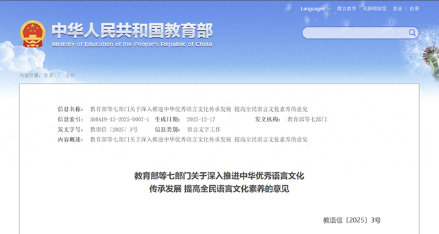 Core Viewpoint - The Ministry of Education and six other departments have issued an opinion to promote the creative transformation and innovative development of excellent Chinese language culture, aiming to enhance the language and cultural literacy of the entire population, especially among young people [1] Group 1: Educational Initiatives - Primary and secondary schools are required to effectively utilize language education elements in curricula and textbooks, strengthen Mandarin and standardized Chinese character writing education, and innovate in conducting special lectures, research practices, and exchange displays [1] - Higher education institutions are encouraged to offer public courses such as University Chinese, Chinese Calligraphy, Digital Chinese, Digital Humanities, and Large Language Model Technology, integrating the cultivation of students' language cultural literacy with the enhancement of academic and professional skills [1] Group 2: Digital Empowerment - The opinion emphasizes accelerating the digitalization of language cultural resources, enhancing large-scale collection, annotation processing, standardized storage, and security governance, as well as establishing a quality assessment mechanism for corpus data sets [1] - It highlights the construction of key corpus data infrastructure, focusing on building databases and resource libraries for oracle bone script, ancient and modern Chinese, and language culture [1] Group 3: International Chinese Education - The opinion calls for strengthening international Chinese education and continuing to hold the World Chinese Conference, while expanding the influence of international Chinese education brand projects such as "Chinese Bridge," "International Chinese Day," "New Sinology Program," and the Chinese Proficiency Test (HSK) [1]
