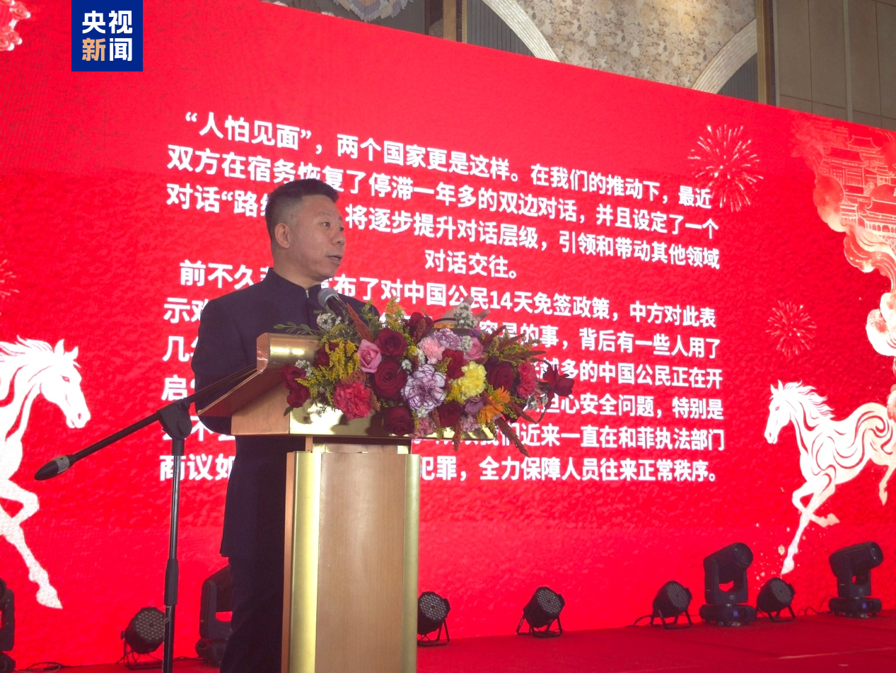 Group 1 - The Chinese Embassy in the Philippines, along with local Chinese organizations, hosted a Spring Festival reception in Manila, celebrating the Lunar New Year with over a thousand attendees, including the Philippine First Lady and representatives from various sectors [1][5]. - Chinese Ambassador to the Philippines, Jing Quan, delivered a speech emphasizing the close geographical and cultural ties between China and the Philippines, highlighting the potential for cooperation and the importance of stabilizing bilateral relations [3][5]. - The Philippine Vice President, Sara Duterte, and the Deputy Foreign Minister, Enrique Manalo, expressed their wishes for the New Year and acknowledged the contributions of the Chinese community in the Philippines, indicating a willingness to enhance dialogue and cooperation with China [5][3]. Group 2 - A promotional video of the Chinese New Year Gala was showcased at the reception, which captivated attendees and highlighted the significance of Chinese cultural traditions, particularly the values of family and unity [8][9]. - A Filipino student, Jenny Eduarte, shared her experience of the gala's promotional video, expressing her desire to visit China and experience the festive atmosphere firsthand, reflecting the cultural exchange between the two nations [8].