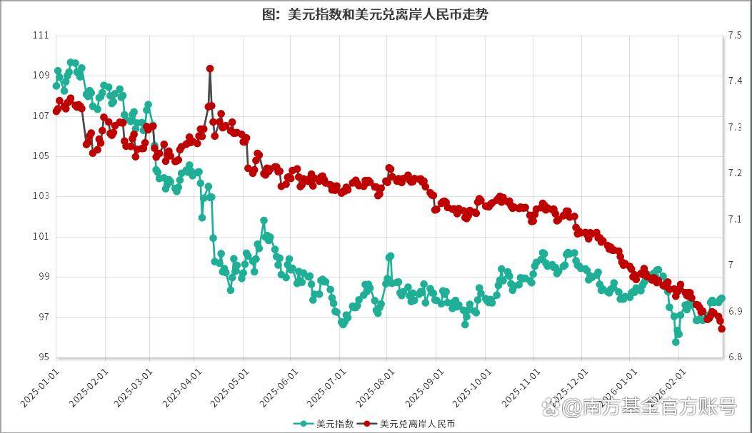 ◉ 外部:美元信用基础松动 美联储2025年累计降息75个基点,美元指数跌至95-100区间弱势震荡。近期美国司法部对美联储主席鲍威尔发起刑事调查,美联储独立性受到冲击, 美元进一步承压。美元偏弱,自然带动包括人民币在内的非美货币升值。 ◉ 内部:万亿顺差+结汇潮形成正反馈 节后开工,除了A股迎来"开门红",汇市也传来大消息。2月25日,在岸、离岸人民币双双升破6.87关口,创下2023年4月以来,也就是近34个月的新 高。进入2月以来,人民币兑美元从6.96附近持续走高,累计升值幅度接近1.3%。(数据来源:Wind,截至2026.02.25。) 不少投资者在问:人民币为什么持续走强?这波升值对咱们的钱袋子意味着什么?中国资产是不是该"高看一手"了?今天我就来聊聊这个话题。 一、人民币为何走强? 本轮人民币升值不是单一因素驱动,而是内外因素共同作用的结果。结合市场上的观点,我总结了三点原因: 负债效应:摩托车、汽零、工程机械、光伏设备等美元有息债务占比高的行业,迎来债务减负和汇兑收益,直接增厚企业当期盈利。 成本效应:电子化学品、种业、冶钢原料等进口依赖度高、出口依赖度低的行业,人民币购买力提升让进口原材料 ...