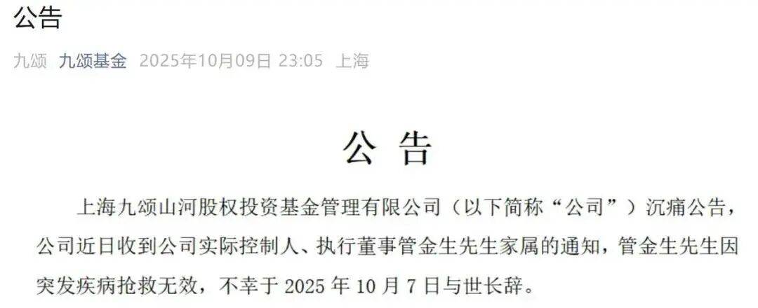 新京报贝壳财经讯(记者胡萌)10月9日晚间11点,九颂基金发布公告,公司近日收到公司实际控制人、 执行董事管金生先生家属的通知,管金生先生因突发疾病抢救无效,不幸于2025年10月7日与世长辞。 业内将其与原君安证券的张国庆、原申银证券的阚治东,并称为中国证券市场的"中国证券教父"。 1992年12月,上海证券交易所(上证所)率先在中国启动国债期货交易。1995年,因"327"国债期货重大 违规操作事件,国债期货于同年5月暂停交易。管金生也因该事件从万国证券辞职,1997年被判处有期 徒刑17年。 2016年,管金生创立上海九颂山河股权投资基金管理有限公司,继续投身于私募基金领域。 公告指出,管金生拥有深厚的专业素养与前瞻性视野,为行业培养了大批人才,对中国资本市场的规范 化、国际化进程作出了不可磨灭的贡献。公司全体员工向其致以崇高的敬意和衷心的感谢,对其逝世表 示沉痛哀悼。 中国政策科学研究会经济政策委员会副主任徐洪才在朋友圈指出,今日早晨,惊闻中国证券教父管金生 先生驾鹤西去,中国资本市场失去了一位先行者、探路人;他是我走进资本市场的领路人,也是洪略全 球智库HLC的特邀高级顾问,我们失去了一位热心肠的好 ...