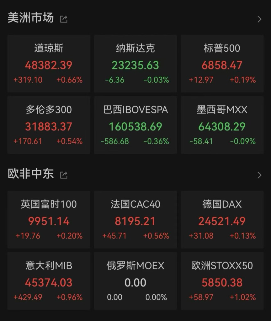 美股三大指数收盘涨跌不一,道指涨1.34%创历史新高,甲骨文跌超10%