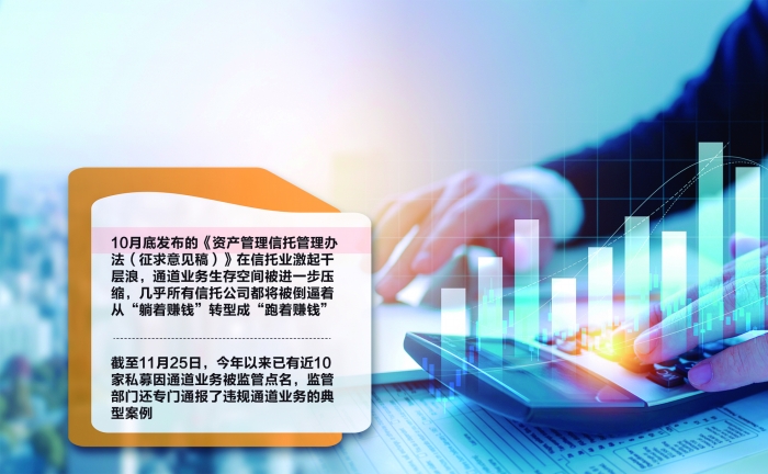 记者采访获悉,部分信托公司在展业过程中会为银行、融资方提供通道业务,收取0.5%。至3%。的管 理费。《办法》要求单个机构投资者及其关联方投资同一信托产品的金额合计不超过信托产品实收规模 的80%,且单个信托产品投资于同一资产的比例不得超过实收信托规模的25%,显著提高了通道业务开 展的操作难度。 郭晨凯 制图 ◎记者 马嘉悦 "通道这下'尴尬了'""产品都要投资组合""老产品整改也是个大工程"……上海一座办公楼中,某信托公 司标品业务负责人张宇(化名)正与相关业务人员开会,逐条讨论《资产管理信托管理办法(征求意见 稿)》(下称《办法》)对业务的影响。 张宇透露,10月底发布的《办法》在信托业激起千层浪,通道业务生存空间被进一步压缩,几乎所有信 托公司都将被倒逼着从"躺着赚钱"转型成"跑着赚钱"。"尽管发布的是征求意见稿,但抛弃通道、迎接 主动管理已是大势所趋。" 同样面临通道压缩的,还有私募行业。公开资料显示,截至11月25日,今年以来已有近10家私募因通道 业务被监管点名,监管部门还专门通报了私募基金违规通道业务的典型案例。在业内人士看来,通道业 务本就存在权责不明、监管套利等风险,不管是私募还是信托都不 ...