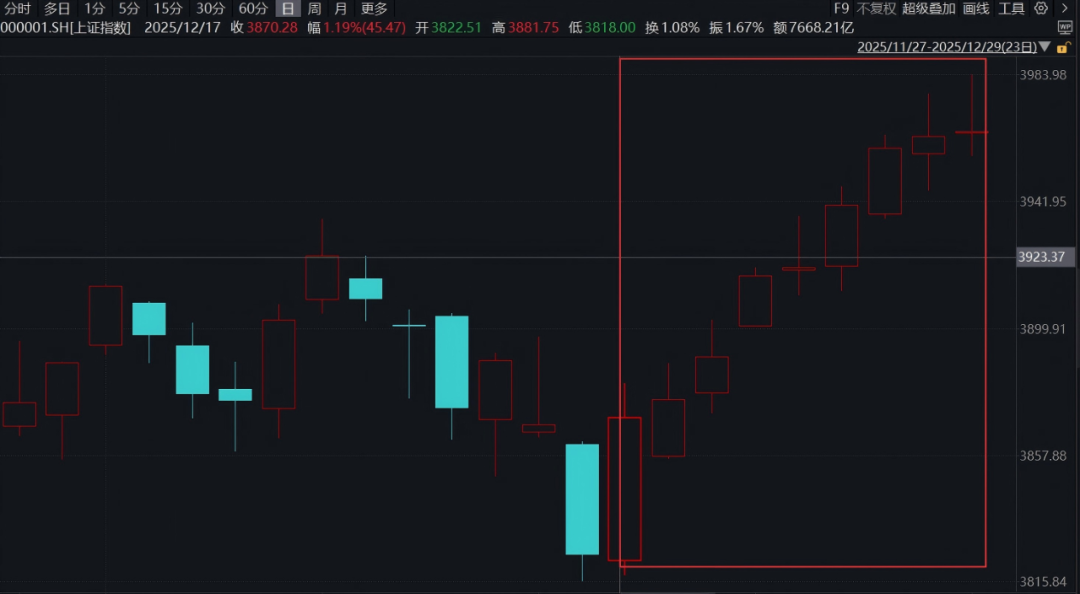 今日,上证指数延续上涨行情,日线迎来"9连阳",刷新今年最长连阳纪录。 12月29日,A股三大指数涨跌不一,沪指微涨迎来"9连阳"。数据显示,截至收盘,上证指数上涨0.04%,收报3965.28点;深证成指下跌0.49%,收报 13537.10点;创业板指下跌0.66%,收报3222.61点。沪深两市合计成交额21393亿元,较上一交易日小幅缩量。 沪指此次"9连阳",打破了年内此前两次"8连阳"的纪录。今年以来,截至12月26日,上证指数最长的连阳纪录是8连阳,一共有两次,一次发生在4月11日 至22日,另一次在8月4日至13日。 上周(12月22日至12月26日),A股市场在指数层面延续强势,从主要指数表现来看,上周万得全A、沪深300和中证2000指数分别上涨2.78%、1.95%和 3.06%。从成交额层面来看,万得全A日均成交额放量至1.97万亿元,在12月26日突破2万亿元大关。 | | 还原 板块名称 | | 涨幅 ÷ | 涨速 | 涨停数 | 電化 | | --- | --- | --- | --- | --- | --- | --- | | 1 | PEEK材料 | 9 | +3.23% | ...
