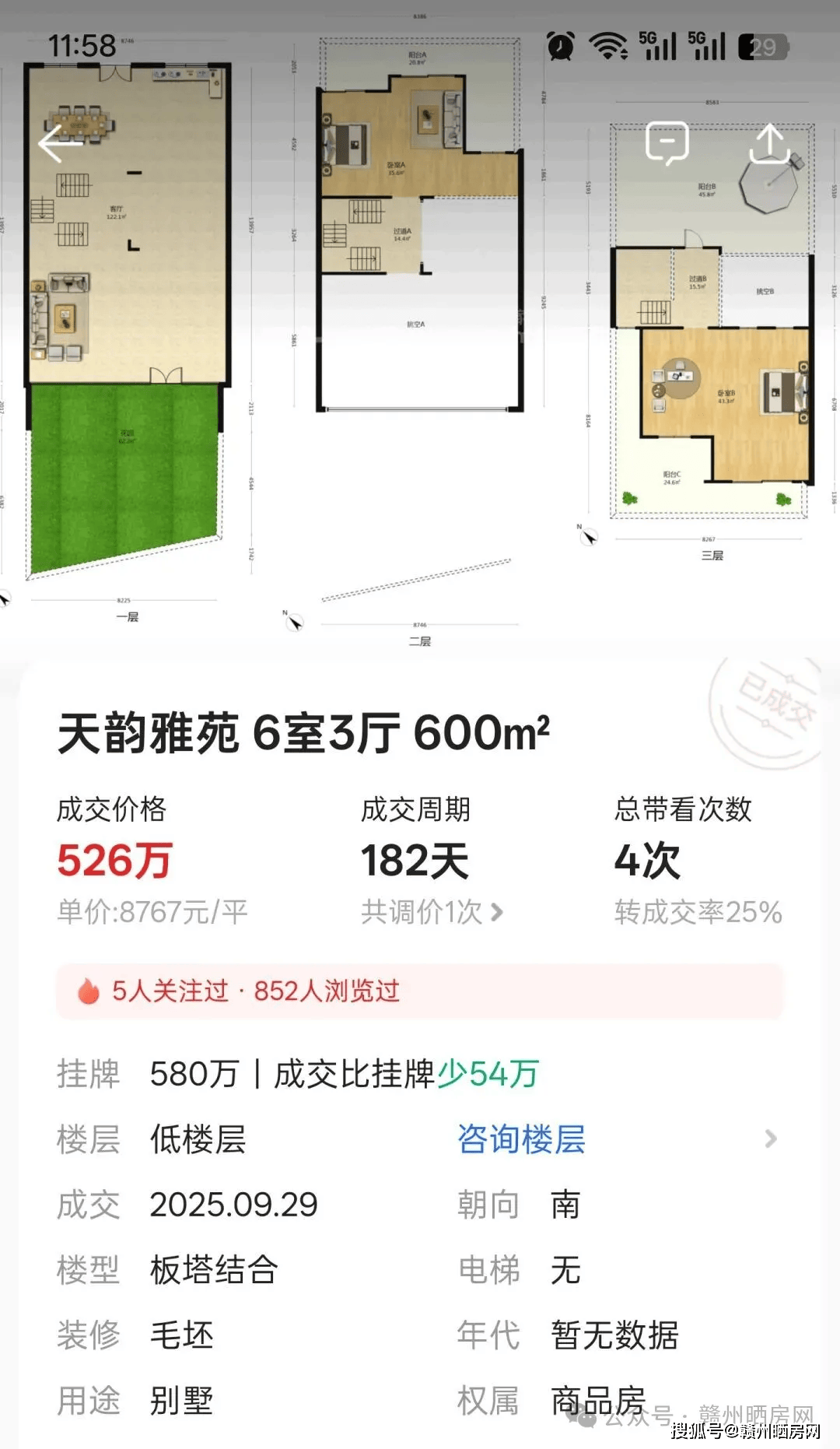 赣州万象城附近一批别墅房源交房10年,一直空置无人居住,最近二手房市场却传来了成交的消息。 近日,小编在二手房平台上发现,位于赣州万象城附近,成交了一套别墅,总价526万元、单价8字头。 这是一套位于天韵雅苑小区的别墅,建筑面积600平,地上三层,毛坯状态。挂牌价580万,最终降价52万,以总价526万、单价8768元/㎡成交。 该房源成交周期182天。于2025年4月份挂牌,首次挂牌价为630万,三个月后降价50万,之后再降价50万成交。与首次挂牌价相比,该房源最终降价102万 成交。 天韵雅苑位于赣州市章江新区登峰大道与梅江路交汇处,由 5 栋 32 层高层住宅和 2栋10套层别墅组成,项目占地面积 22934.6㎡、总建筑面积 87765.32 ㎡,容积率 3.0、绿化率 35%、共 614 户,于2015年交房,由赣州众诚物业提供物业服务。 小区地理位置优越,周边配套十分丰富,紧邻中央生态公园、万象城商圈,赣州中学与文清路小学等优质教育资源也分布在侧,区位优势较为突出。 r Helsin 绕中心 动漫 曲 赣州嘉莱特沁庐酒店 सित 3 70 府 。 o 中国电信 4 CMETER CHEVERE R ...