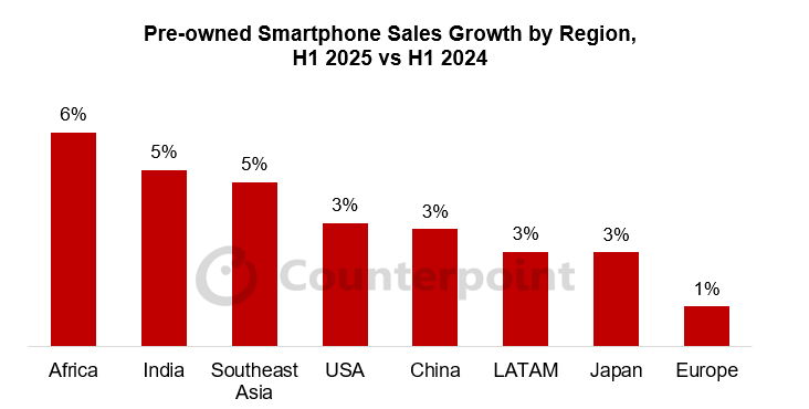 Core Insights - The second-hand smartphone market in mature regions like Europe, the US, and Japan is expected to show flat performance in the first half of 2025, with an average year-on-year growth of about 1% [1] - In contrast, emerging markets such as Africa, India, Southeast Asia, China, and Latin America are projected to remain active, with an average year-on-year growth of approximately 4%, significantly higher than the global average [1] Group 1: Africa Market Insights - The African second-hand smartphone market is anticipated to grow by 6% year-on-year in the first half of 2025, making it the fastest-growing region globally [5] - Factors driving growth include the increasing number of authorized retailers absorbing sales from informal channels and government-led initiatives like "Bridge by Digital Africa" that support local refurbishment ecosystems [5] - The popularity of imported second-hand iPhones is attributed to economic pressures and consumer perceptions of reliability and longevity compared to local new devices [5] Group 2: India Market Insights - The Indian second-hand smartphone market is expected to grow by 5% year-on-year in the first half of 2025, led by Apple [6] - Authorized retailers are accelerating online and offline recycling programs, positioning refurbished high-end models as reliable and cost-effective alternatives [6] - The market demand is shifting towards newer models due to retailer-driven trade-in programs and extended warranty services [6] Group 3: Southeast Asia Market Insights - The Southeast Asian second-hand smartphone market is projected to grow by 5% year-on-year, supported by a large informal channel system and stable inflow of second-hand devices and components from China [9] - C2C transactions driven by online platforms are becoming a significant growth engine for the second-hand market, fueled by improved consumer trust and supply chain enhancements [9] - Apple is leading the market with a 15% year-on-year growth, primarily due to the popularity of iPhone 12 and 13 models [10] Group 4: Mature Markets Insights - Mature markets like the US, Europe, and Japan are experiencing stable performance, with supply constraints and declining exports to emerging markets affecting sales [11] - In the US, market sentiment is volatile, with retailers and OEMs stockpiling components to mitigate potential policy changes [11] - In Japan, the recognition of officially certified second-hand smartphones is increasing, supported by government initiatives promoting transparent pricing [11]