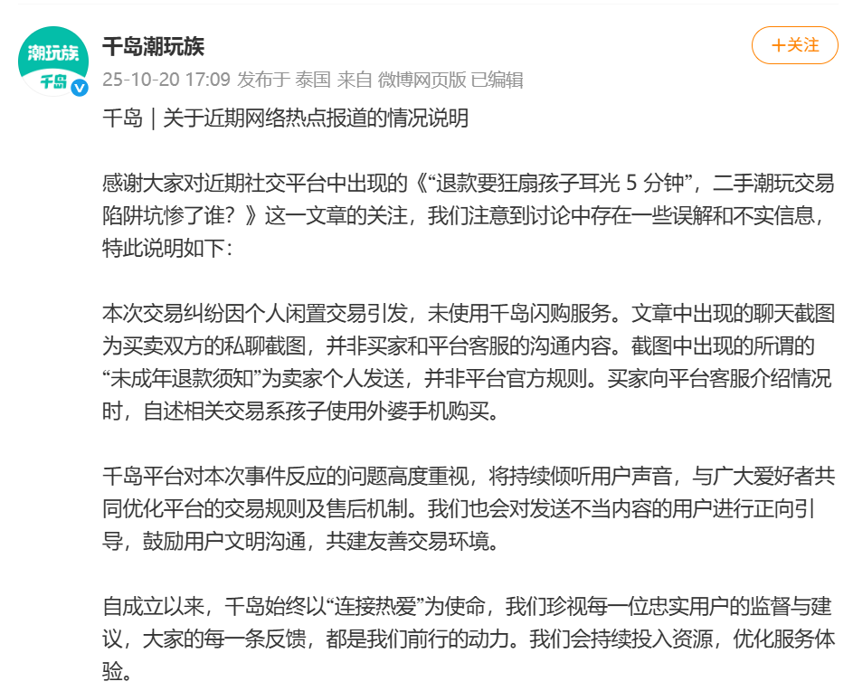 每经编辑|程鹏 近日,一起发生在潮玩交易平台千岛上的退款纠纷受到广泛关注,其中"要求退款要扇孩子耳光5分钟"的极端条款备受公众质疑。 10月20日,@千岛潮玩族 发布关于近期网络热点报道的情况说明:感谢大家对近期社交平台中出现的《"退款要狂扇孩子耳光5分钟",二手潮玩交易陷阱 坑惨了谁?》这一文章的关注,我们注意到讨论中存在一些误解和不实信息,特此说明如下:本次交易纠纷因个人闲置交易引发,未使用千岛闪购服务。 文章中出现的聊天截图为买卖双方的私聊截图,并非买家和平台客服的沟通内容。截图中出现的所谓的"未成年退款须知"为卖家个人发送,并非平台官方 规则。买家向平台客服介绍情况时,自述相关交易系孩子使用外婆手机购买。 千岛平台对本次事件反应的问题高度重视,将持续倾听用户声音,与广大爱好者共同优化平台的交易规则及售后机制。我们也会对发送不当内容的用户进 行正向引导,鼓励用户文明沟通,共建友善交易环境。 此前据媒体报道,一位母亲发现自己11岁的女儿在千岛App购买了500多元的卡牌后,便想要找卖家退货退款。但却被告知, "上传家长怒骂孩子的视频 、狂扇孩子耳光的视频(时长需要5分钟,中间不能停,必须有清晰的扇耳光的声 ...