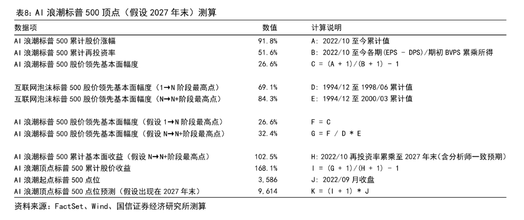 如果历史是一面镜子,AI浪潮正在映照出1998年的影子。国信证券王学恒团队27日发布的年度策略报告认为,当前的AI产业发展阶段在时间维度 上高度类比互联网泡沫时期的1998年初,即"1→N"阶段的后期。 对比互联网泡沫时期,当前AI浪潮在空间演绎上仅达到彼时极限的约三分之一。数据显示,自2022年10月以来,标普500指数股价跑赢基本面的 幅度约为27个百分点,远低于互联网泡沫时期最高85个百分点的水平。纳斯达克与标普500的风格分化程度也仅为当时的三分之一左右。这意味 着,尽管近期市场对高估值的担忧升温,但从历史水位来看,AI行情的估值压力尚未达到极值。 这一判断对投资者的直接影响在于重新校准对未来两年的预期。报告预测,AI浪潮的"1→N"阶段将在2026年年中迎来尾声,届时市场或将经历一 次温和回调,标普500可能回撤至6700点附近。然而,这并非行情的终结,而是"N→N+"阶段的前奏。随后的2026年下半年,随着泡沫集中产生, 大盘尤其是科技股有望加速发力,甚至推动标普500在2027年末冲击9600点的高位。 | 数据项 | 数値 | 计算说明 | | --- | --- | --- | | AI 浪 ...