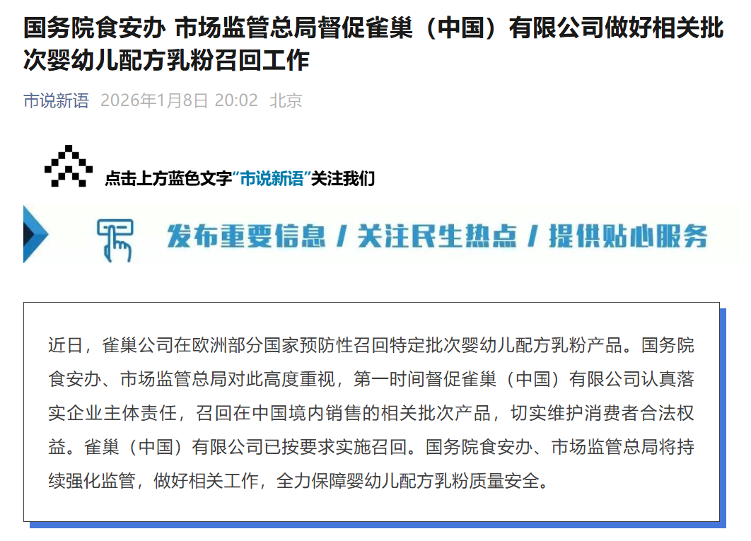 近日,雀巢公司在欧洲部分国家预防性召回特定批次婴幼儿配方乳粉产品。国务院食安办、 市场监管总局对此高度重视,第一时间督促雀巢(中国)有限公司认真落实企业主体责任, 召回在中国境内销售的相关批次产品,切实维护消费者合法权益。雀巢(中国)有限公司已 按要求实施召回。国务院食安办、市场监管总局将持续强化监管,做好相关工作,全力保障 婴幼儿配方乳粉质量安全。 总部位于瑞士的雀巢公司当地时间8日表示,受可能存在有毒污染影响的产品已在至少50个国 家和地区启动召回。 拉美、亚洲、非洲和中东多个主要市场受影响,包括巴西、智利、中 国、埃及、卡塔尔、沙特和阿联酋,澳大利亚和新西兰亦被纳入召回范围。 涉事产品包括知名品牌Beba及特殊配方产品Alfamino。 雀巢敦促家长停止使用相关批次并 退货。消费者组织要求雀巢和监管机构就受影响国家、产品和工厂提供全面透明的信息。 版权声明 证券时报各平台所有原创内容,未经书面授权,任何单位及个人不得转载。我社保留追 究相关 行 为主体 法律责任的权利。 转载与合作可联系证券时报小助理,微信ID:SecuritiesTimes END 点击关键字可查看 潜望系列深度报道丨 股事会专栏 丨 ...