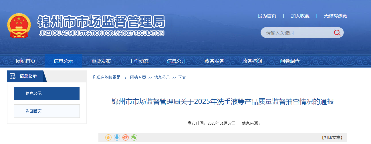 辽宁省锦州市市场监督管理局通报2025年洗手液等产品质量监督抽查情况
